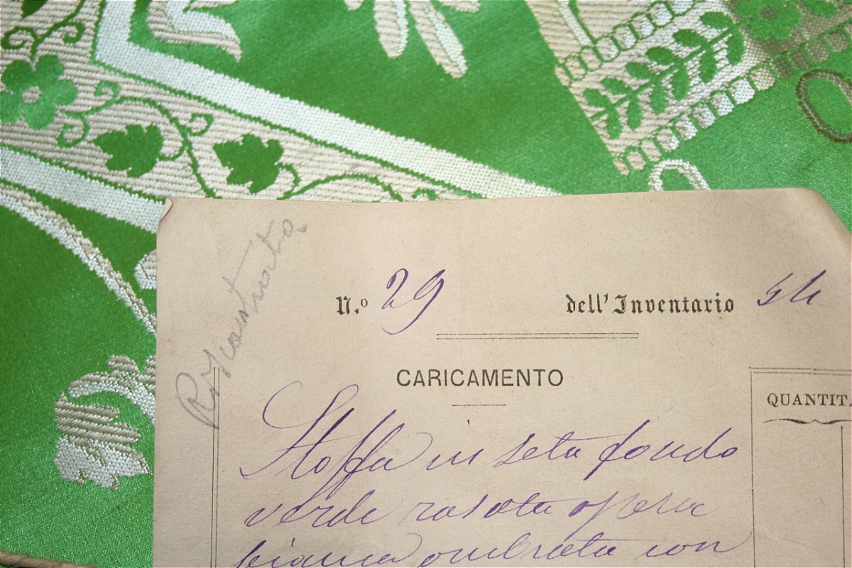 - ISCRIZIONI sul cartellino - N. 29 dell'Inventario 54(?). Stoffa in seta fondo verde rasato opera bianca ambrata con stelle riscontrata M. 214 - numeri arabi -