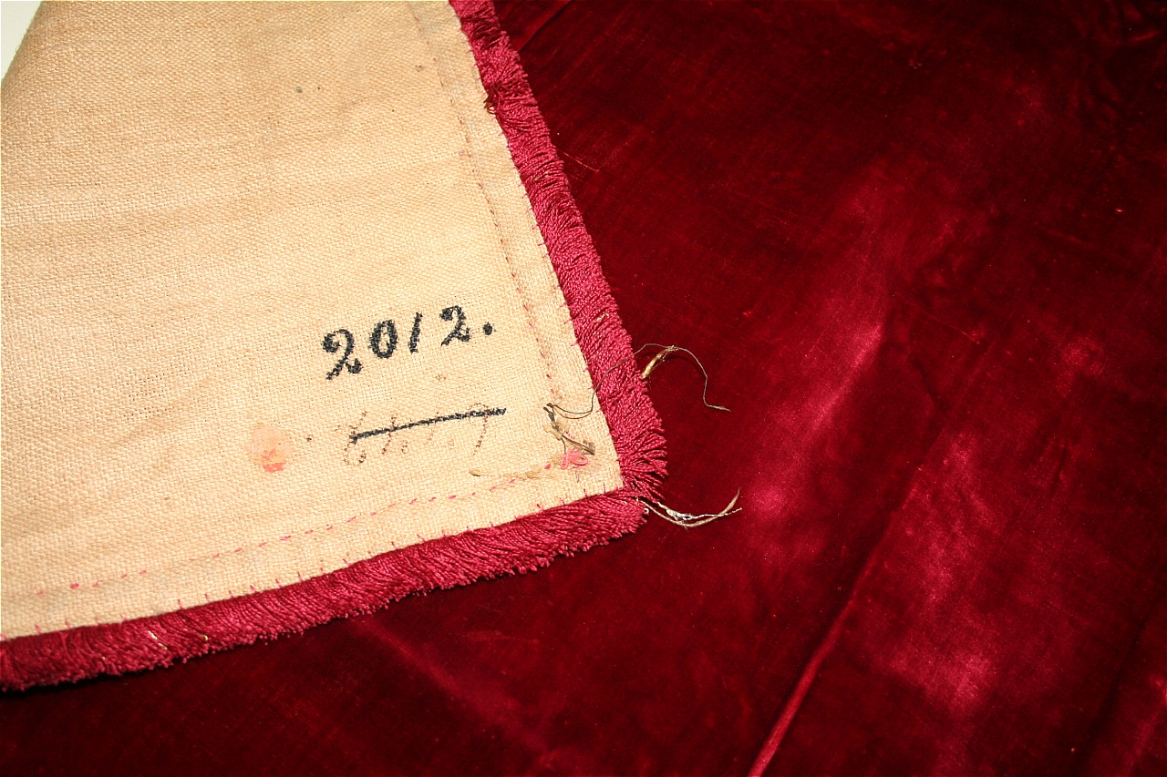 Coperta in velluto di seta unito color cremisi, misure: 163x202cm. Frangia H 2,5cm color cremisi e oro. Fodera in canapa color naturale