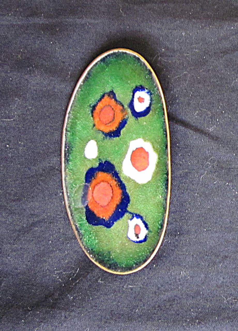 Spilla di formato rettangolare con angoli stondati e bordo lievemenete rialzato campita in smalto blu con motivi in smalto verde, arancio e bianco