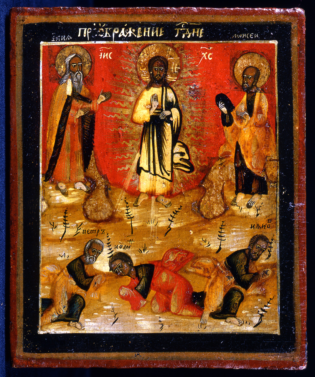 - NOTIZIE STORICO CRITICHE Come l'altra icona dello stesso soggetto nella collezione della Galleria dell'Accademia (inv. 1890/9313), l'icona in esame riproduce la variante tradizionale per l'arte bizantina e anticorussa, dell'iconografia della Trasfigurazione. Nella parte inferiore della composizione, in cui sono raffigurati gli apostoli prostrati, collocazione e disegno delle figure coincidonoquasi completamente nelle due icone. Nella parte superiore differiscono atteggiamenti e gesti dei personaggi e il loro abbigliamento; così Mosè tiene le tavole della legge con una sola mano, e non con due, e Elia indossasopra il chitone, il mantello di pelli e non l'himation. E' differente anche il disegno della gloria che circonda la figura del Cristo. Inoltre nonc'è la raffigurazione del semicerchio di nuvole che nasconde i piedi diCristo e dei profeti: essi sono raffigurati in piedi sulla vetta del monteTabor, secondo l'uso più tradizionale dell'iconografia anticorussa. Probabilmente il maestro (o i maestri) che hanno eseguito queste icone, hanno liberamente combinato i modelli che avevano a disposizione. Attribuzione. L'icona rientra nel vasto gruppo di piccole opere artigianali dellacollezione dell'Accademia fiorentina; tra le quali particolari analogiepresenta la "Nascita della Madre di Dio" (inv. 1890/9303). Oltre ai procedimenti artistici comuni a tutto questo gruppo, le due icone hanno un medesimo tono di base ocra scuro, marrone-rossastro, quasi senza schiariture, sopra il quale è tracciato uno schematico disegno, messo in risalto da tratti in biacca. Probabilmente le due opere sono state eseguite dallo stessomaestro e facevano parte del medesimo ciclo di icone delle feste