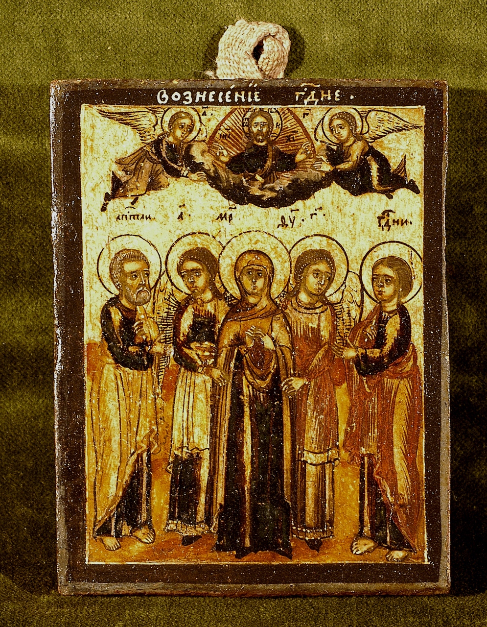 - NOTIZIE STORICO CRITICHE L'Ascensione del Signore è una delle dodici feste, e viene celebrata dallachiesa al quarantesimo giorno dopo la Pasqua. Fu istituita nel IV secolo aricordo dell'ascensione al cielo di Cristo, con il suo corpo materiale,che avvenne sul monte Eleon, vicino a Gerusalemme, in presenza degli apostoli. Fonti storiche sono i Vangeli di Marco (XVI, 19) e di Luca (XXIV, 50-52), e gli Atti degli Apostoli (I, 9-12). Nei testi è detto che prima dell'ascensione Cristo benedisse i discepoli e li esortò ad attendere il battesimo nello Spirito Santo. Due angeli apparsi agli apostoli annunciaronoil futuro ritorno di Cristo sulla terra "a suo tempo" per giudicare l'universo. Nella tradizione ortodossa la festa dell'Ascensione viene interpretata come avvenimento che completa la salvazione del mondo e che conferma l'autorità della Chiesa apostolica sulla terra. L'iconografia di questo temasi è venuta a formare nell'arte bizantina dei secoli V e VI e per moltisecoli è rimasta molto più stabile rispetto alla raffigurazione delle altre dodici feste. Possono variare i dettagli, ma la composizione nel complesso praticamente non cambia. La presenza della Madre di Dio sulla scena dell'Ascensione, non viene citata nelle narrazioni evangeliche, ma è basata sui testi liturgici della festa. Tra i discepoli del Salvatore viene raffigurato l'apostolo Paolo, anche se non fu testimone di questo avvenimento dato che credette e ricevette il battesimo molto dopo l'Ascensione. Infatti importante nell'iconografia dell'Ascensione non è una veridica raffigurazione di un fatto della storia evangelica, ma la resa del suo significatosimbolico, mistero fondamentale della chiesa terrestre. Nelle icone dell'Ascensione, la Madre di Dio, spesso denominata nei testi liturgici "tempiodel Dio vivo", personifica la chiesa che prega Cristo. Giustamente la suafigura, che si trova al centro della composizione, è statica, a differenza degli altri personaggi. Si distingue anche dagli angeli in vesti chiareche le stanno ai lati. I discepoli di Cristo appaiono come "riunione di fedeli", come la prima chiesa apostolica. Per l'opera in esame è stata adottata una variante semplificata dell'iconografia del soggetto. Sono statiraffigurati solo due dei dodici apostoli; il Cristo nella mandorla è raffigurato a mezza figura anziché a figura intera. Tra le particolarità iconografiche, da notare il gesto del Salvatore, che benedice con ambedue la mani in qualità di sommo sacerdote della chiesa da lui fondata. Attribuzione. Il soggetto dell'opera in esame è stato erroneamente indicato da L.Marcucci come Discesa dello Spirito Santo. Seguendo l'opinione di Bettini, la studiosa ha riferito l'icona alla scuola Stroganov del XVII secolo e ha trovato una serie di precise analogie di stile con opere della collezione della Galleria dell'Accademia, quali la Resurrezione e discesa agli inferi (inv.1890/9310), Natività della Madre di Dio (inv 1890/9312) e Incoronazione della Madre di Dio (inv 1890/9319. Il gruppo di opere, al quale, come correttamente osserva L. Marcucci, si riferisce per le caratteristiche artistiche l'icona in esame, è da ritenere di epoca più tarda: del secondo quarto del XVIII secolo. L'affinità tra le opere di questo gruppo è dovuto all'analogia dei principi adottati per la semplificazione della composizione, della colorazione, della maniera pittorica; che è stata una peculiaritàdell'arte russa di provincia di quel periodo. Inoltre, tutte le icone quisegnalate possiedono caratteristiche secondarie analoghe: la struttura della tavola, i colori dei bordi e dei margini, lo stile delle iscrizioni, lapresenza di una delimitazione in biacca tra pannello centrale e bordi. E'probabile che a realizzare queste icone sia stato un solo artista