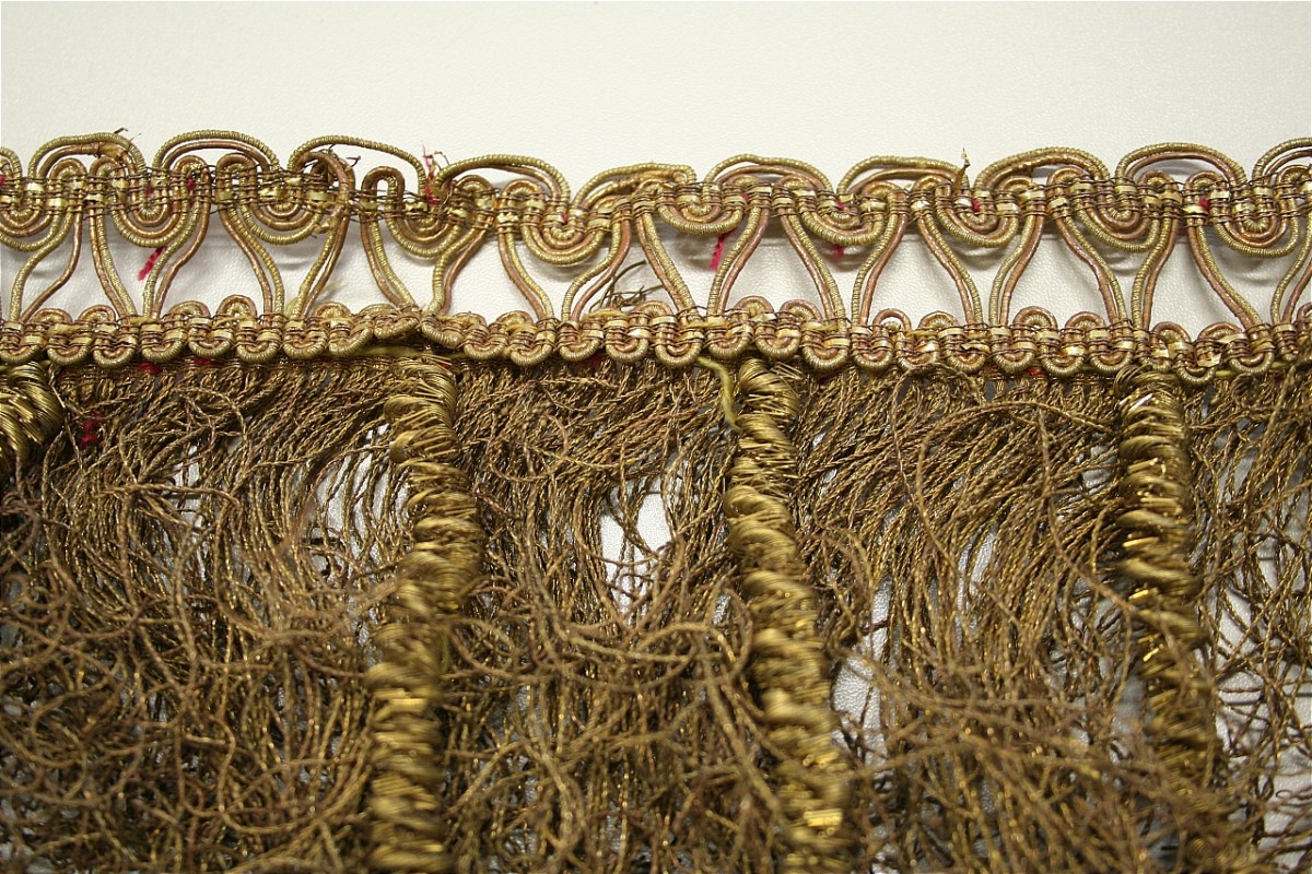 Agrement in metallo dorato filato e lamellare. Frangia in metallo dorato filato