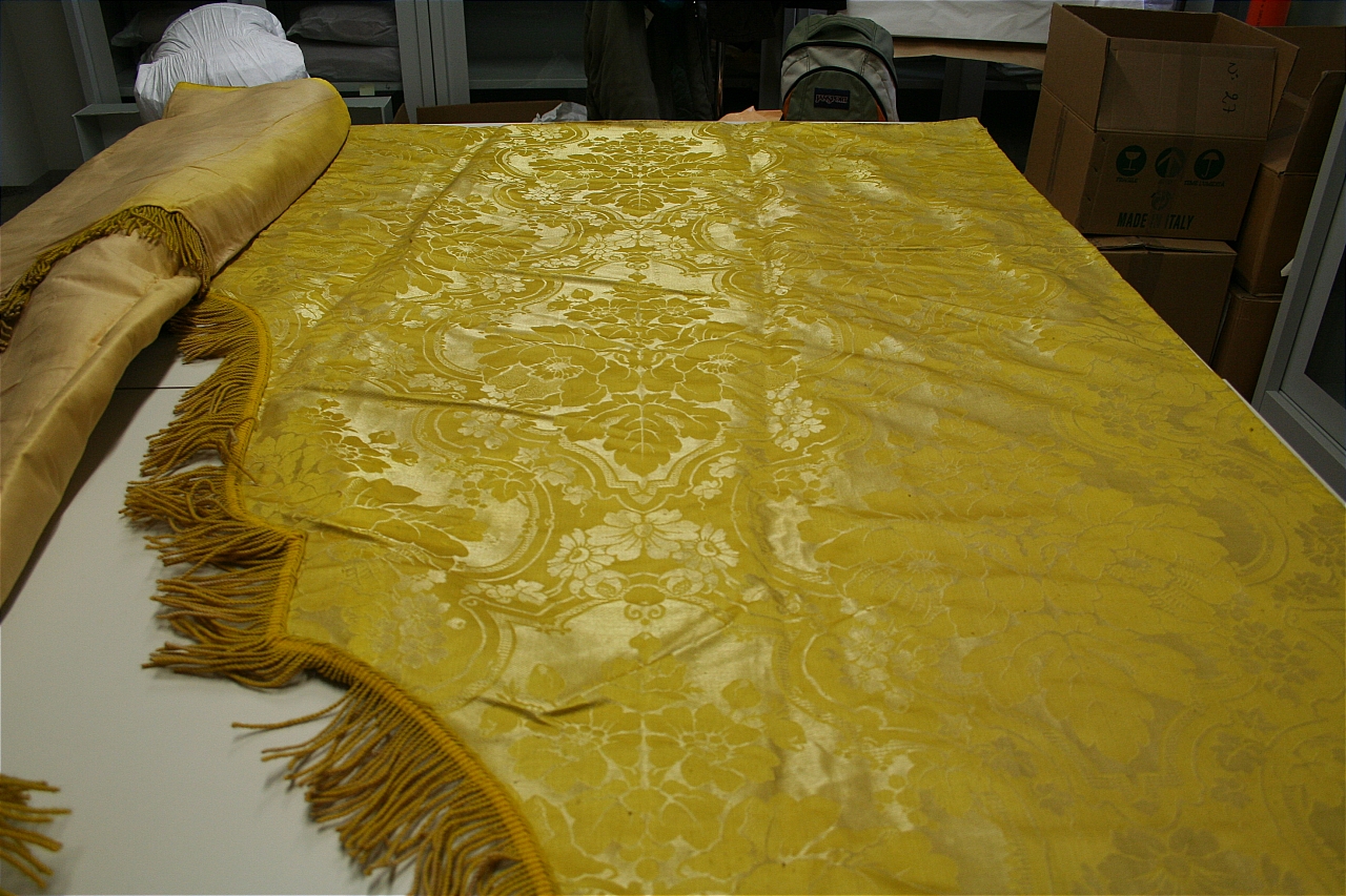Pendone in tessuto operato, fondo giallo e opera in bianco. Frangia in lana color giallo. Fodera in cotone color giallo virato in rosa