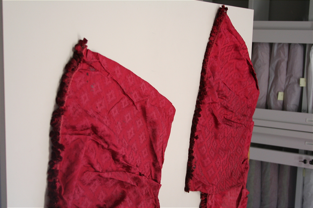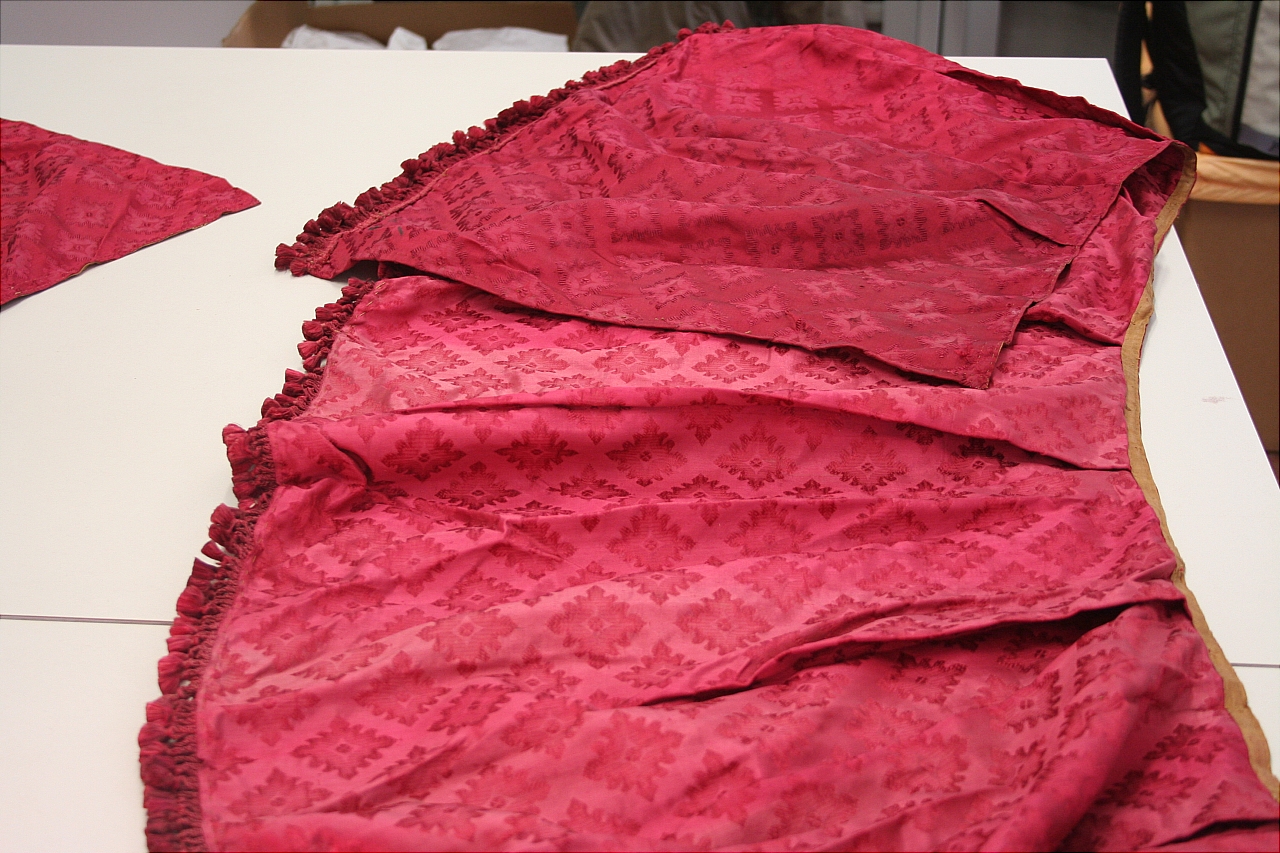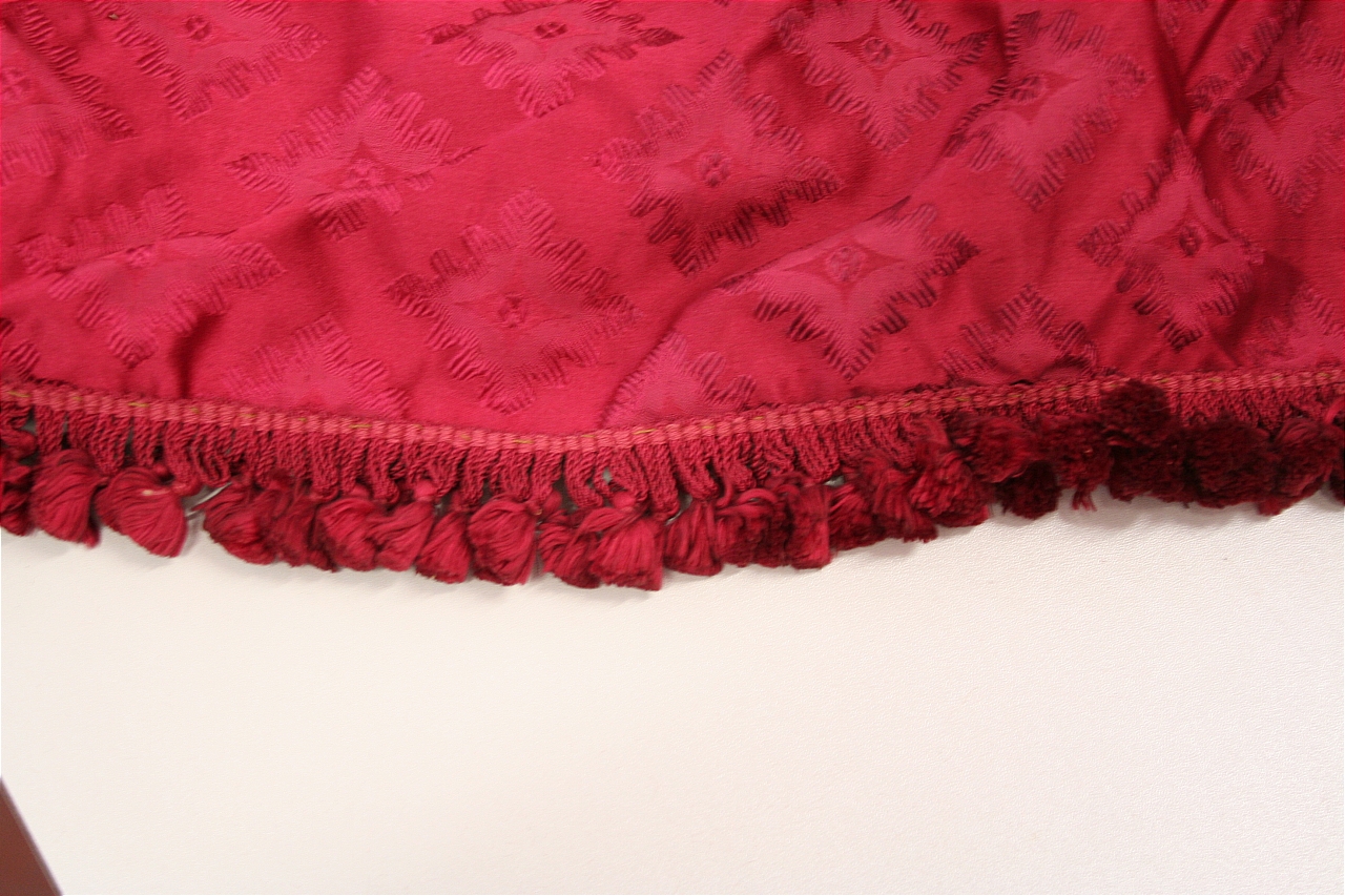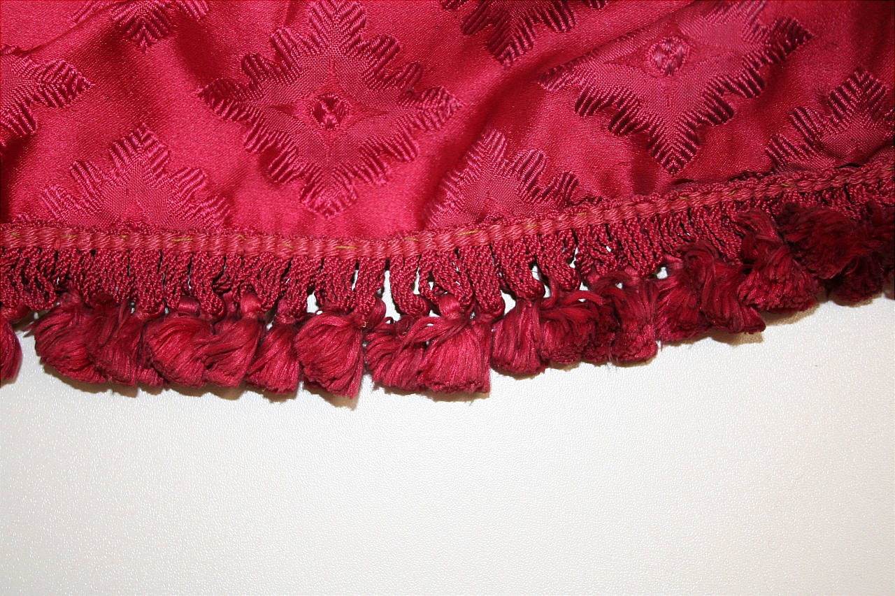 Due pendoni in tessuto operato di seta, fondo e opera in cremisi. Frangia con nappe in seta color cremisi