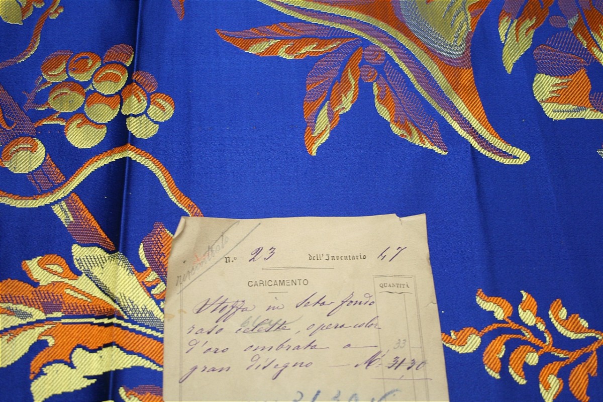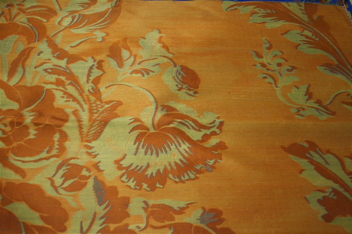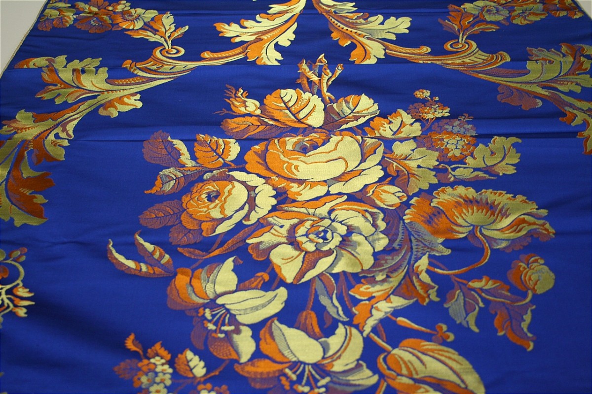 Parato da muro in 7 pezzi in lampasso di seta, fondo raso blu opera in giallo oro e bronzo