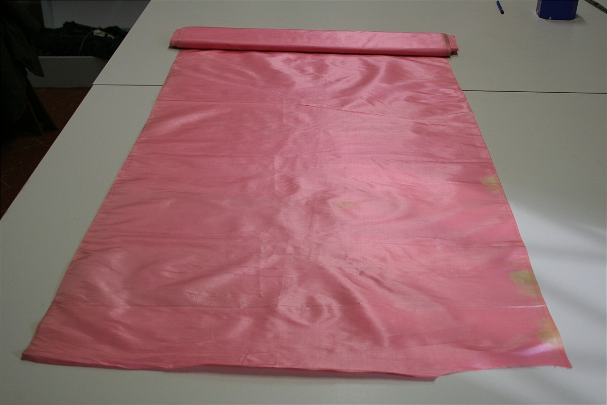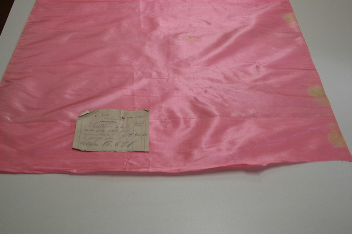 - ISCRIZIONI sul cartellino - N.°308 dell'Inventario 696/ Lustrino color rosa alto M. 0,60/ riscontrato mt. 21,65 in pezzi due/ Metri 15,65 (violetto) - corsivo -