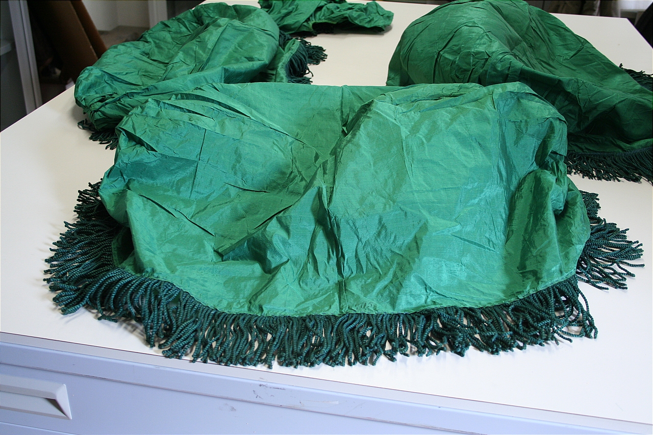 Drapperia in 6 pezzi in taffetas color verde con frangia in seta e cotone color verde