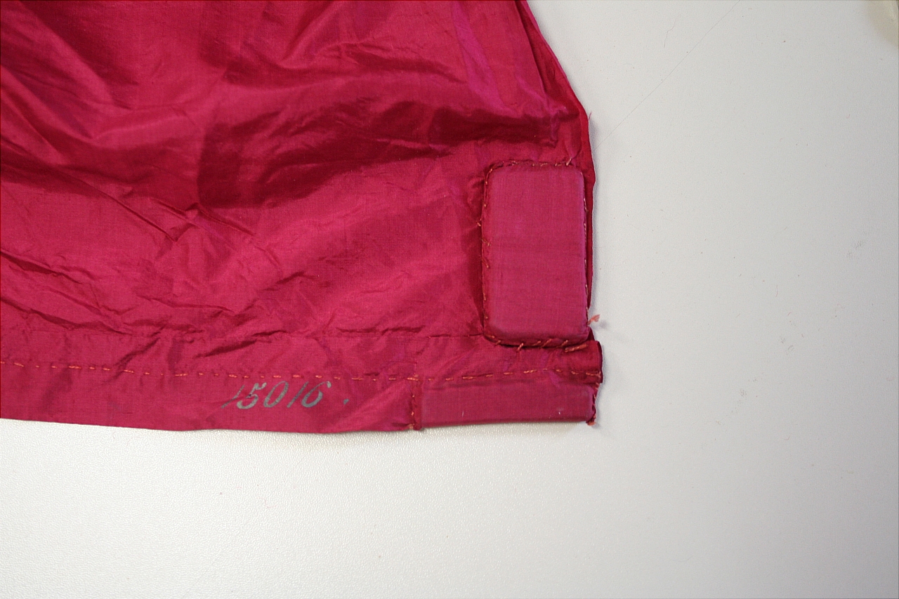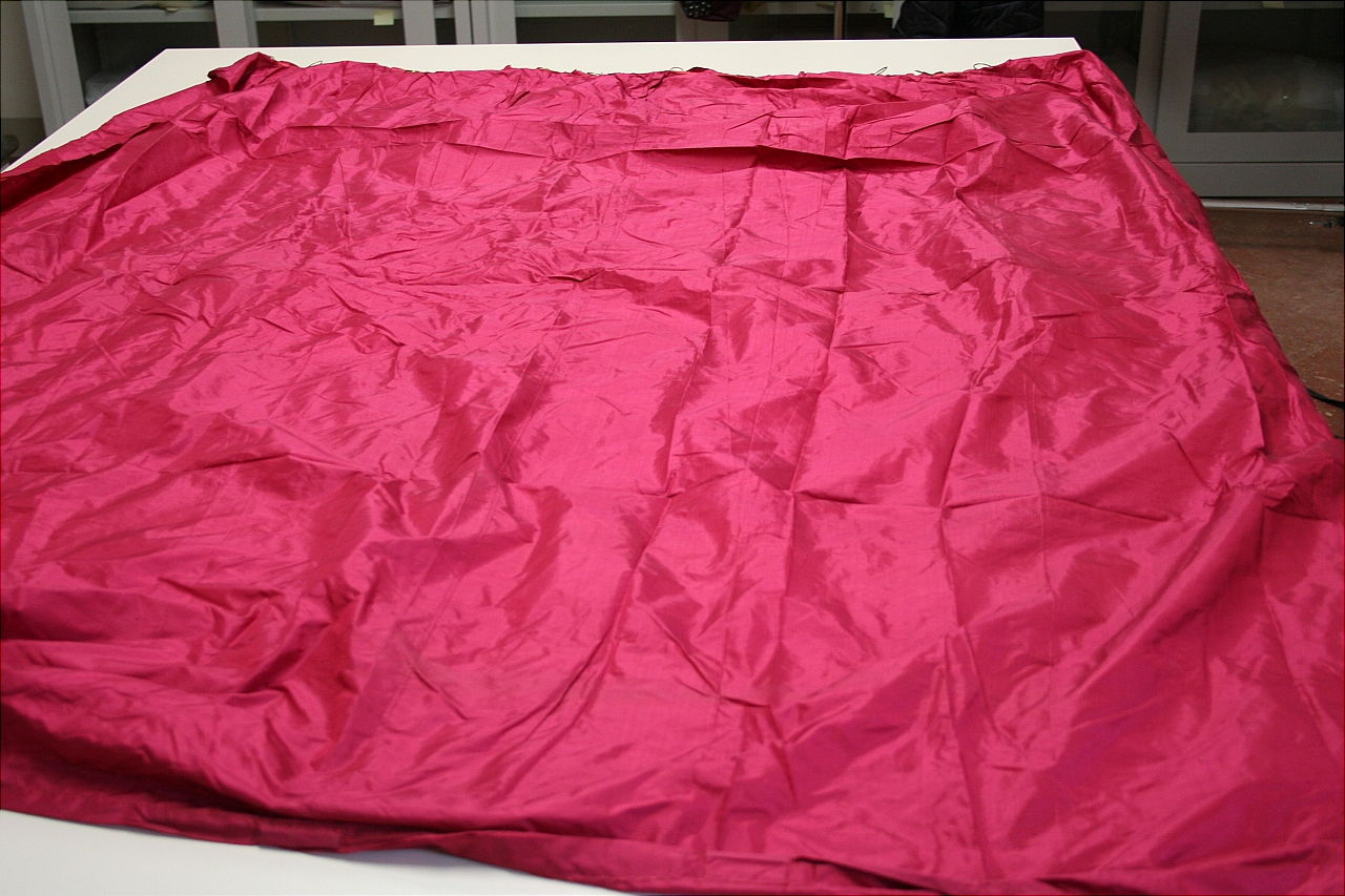 Due tende in tessuto unito di seta, taffetas color cremisi. Otto pesini in piombo cuciti all'orlo inferiore