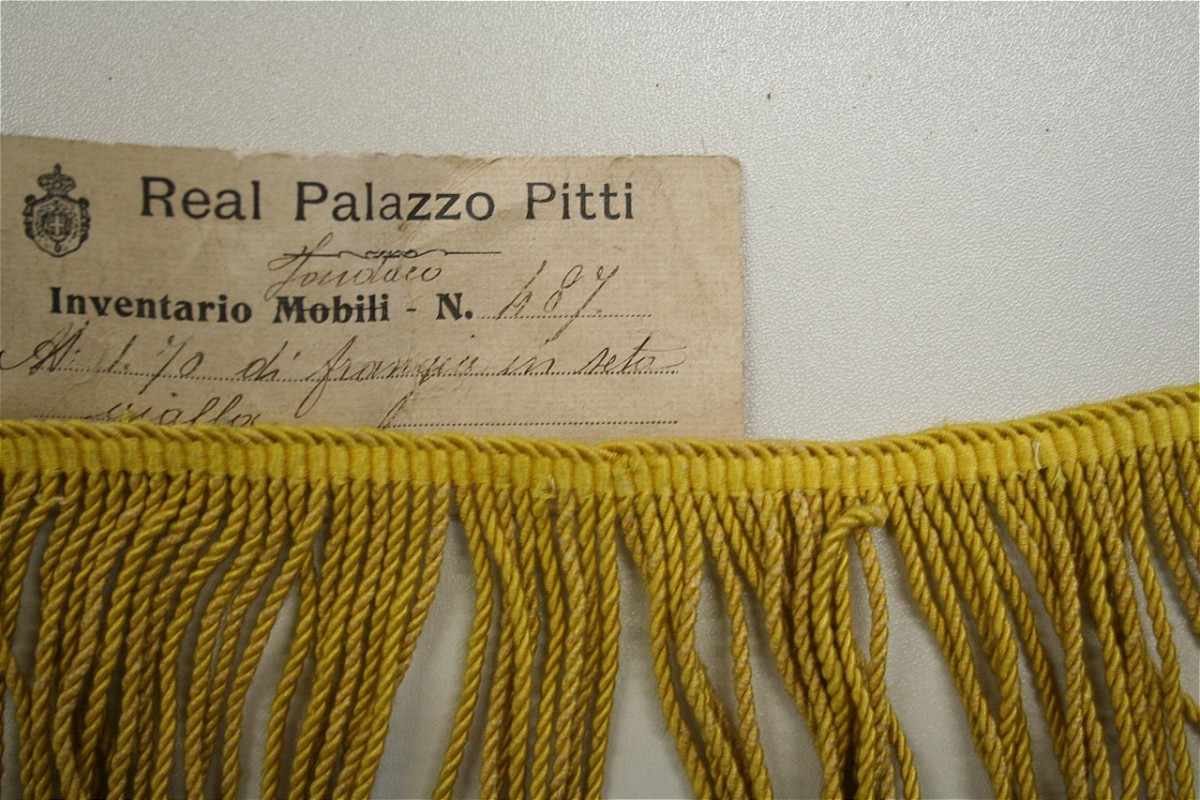 - ISCRIZIONI sul cartellino - Real Palazzo Pitti/ Inventario Fondaco - N° 487/ M. 1,70 di frangia in seta gialla. (nero) - corsivo -