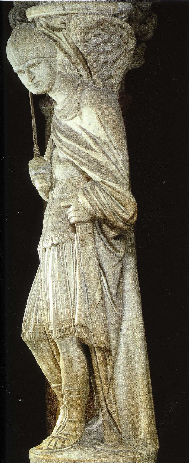 - NOTIZIE STORICO CRITICHE Il capitello è da ritenersi probabilmente trecentesco (con tracce di rilavorazione) ma non sicuramente pertinente al pergamo. Il confronto con l'incisione ottocentesca di Giovan Paolo Lasinio (LASINIO 1814-1825, tav. CXLVI, n. 150) conferma che il piccolo capitello tondo foliato posto sopra la testa della figura di "S. Michele" è interamente originale. La spada, che non compare nell'incisione suddetta, è integrazione risalente verosimilmente ai lavori intrapresi da Fontana e Sarrocchi per la ricomposizione del pergamo. L'identificazione con "S. Michele", posta in dubbio da Valenziano (1993 b, p. 63; lo studioso vi scorge una raffigurazione tipologica di Cristo, che indica poi come "Cristo Angelo di Jahvè", p. 44, didascalia), è confermata dalla presenza di una figura iconograficamente analoga presente nel rilievo degli "Eletti" (40001161.26) e ivi facilmente identificabile con l'Arcangelo Michele