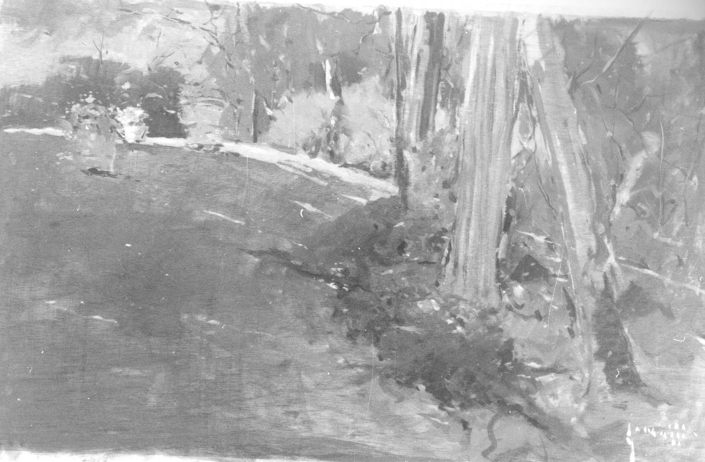 Dipinto a olio su tavola raffigurante una radura con alberi e cespugli. Colori: verde, nero, rosso