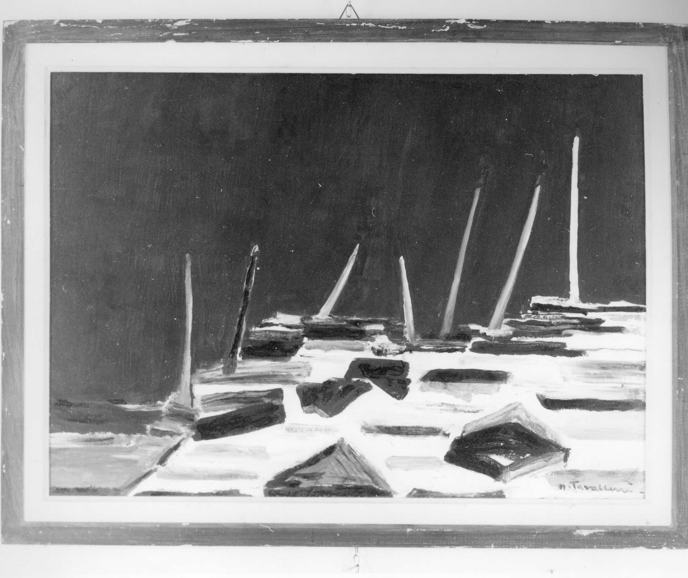 Dipinto a olio su tela raffigurante una veduta di un porto in notturna. Colori: blu, rosaceo, bianco, nero