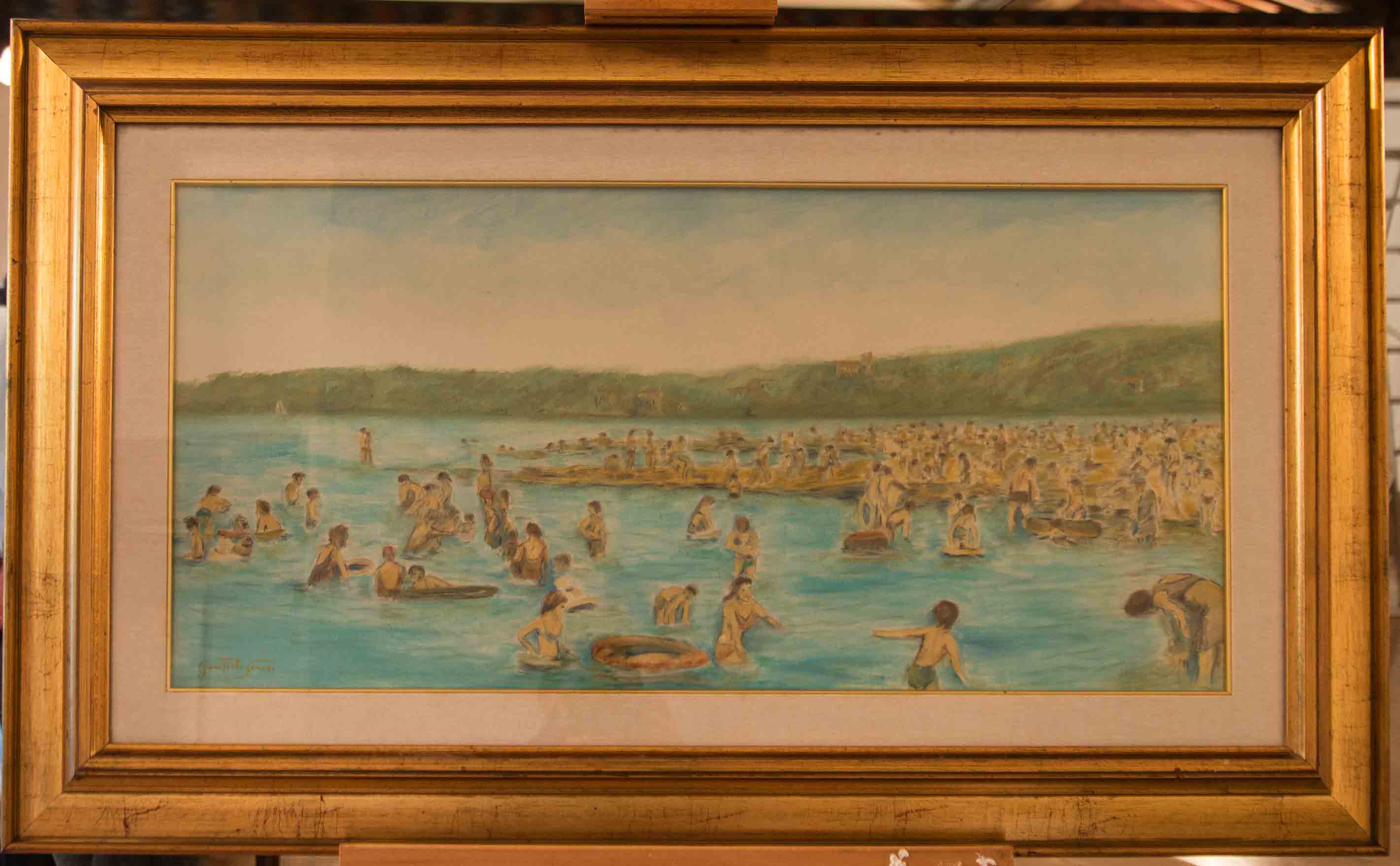 Dipinto a olio su tela entro cornice in legno raffigurante una scena di mare con bagnanti e spiaggia affollata. Colori: azzurro, verde, beige