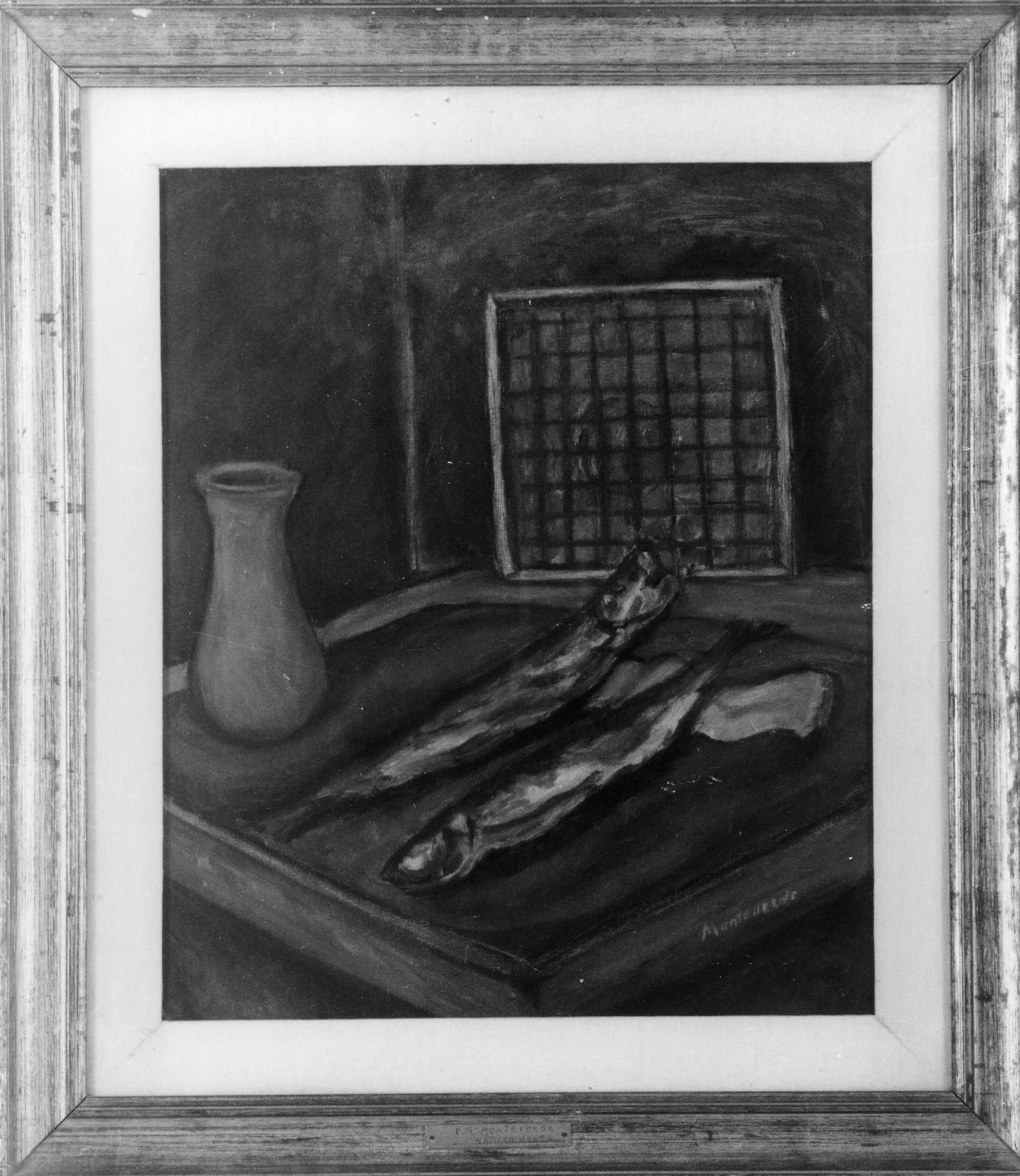 Dipinto a olio su tela entro cornice in legno dorato raffigurante una natura morta con pesci, un vaso e una griglia quadrata sul fondo. Colori: mattone, blu, violaceo. In basso a destra è la firma