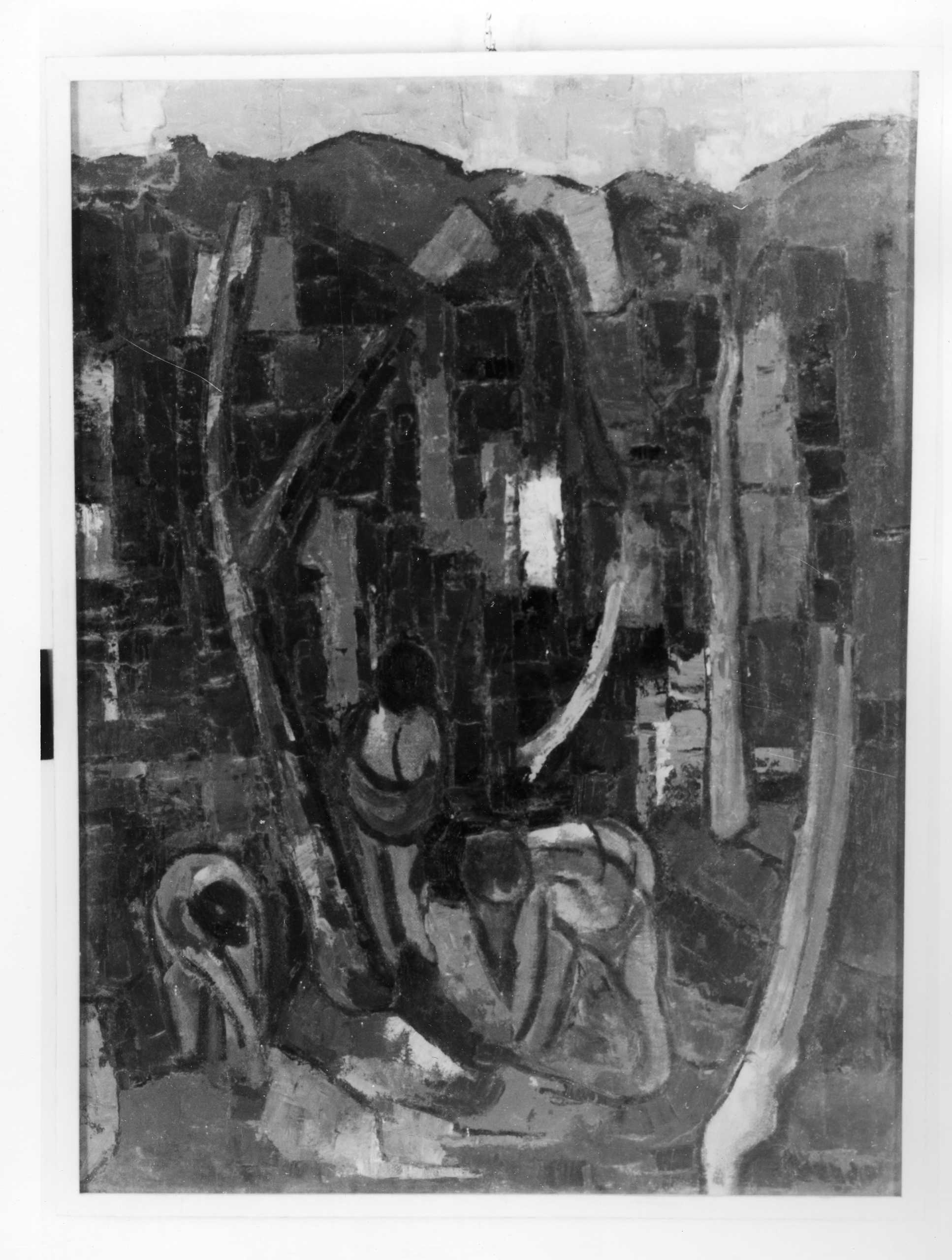 Dipinto a olio su cartone raffigurante un gruppo di bagnanti e, sullo sfondo, degli scogli. Colori: blu, beige, rosato, verde