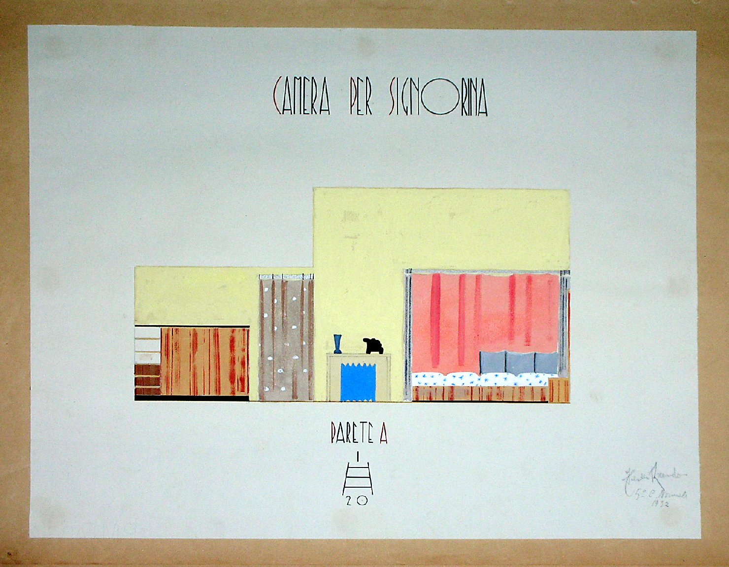 - ISCRIZIONI Sopra e sotto il disegno, posizione centrata - CAMERA PER SIGNORINA / PARETE A / SCALA 1:20 / Filidei Rolando / 5° C. Normale / 1932 - lettere capitali - a matita -