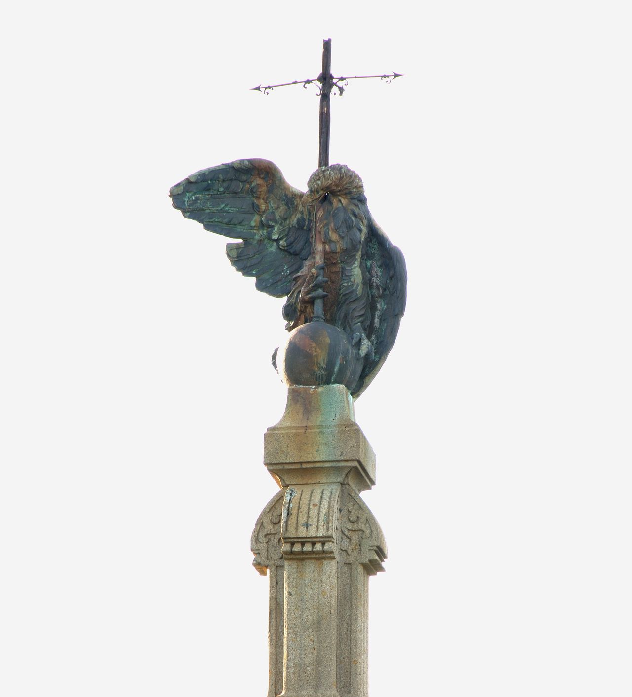 Base gradinata da cui si sviluppa un corpo quadrangolare dove sono poste le lastre di marmo con le iscrizioni, sormontato da alte colonne su cui poggia l'allegoria dell'Aquila ferita