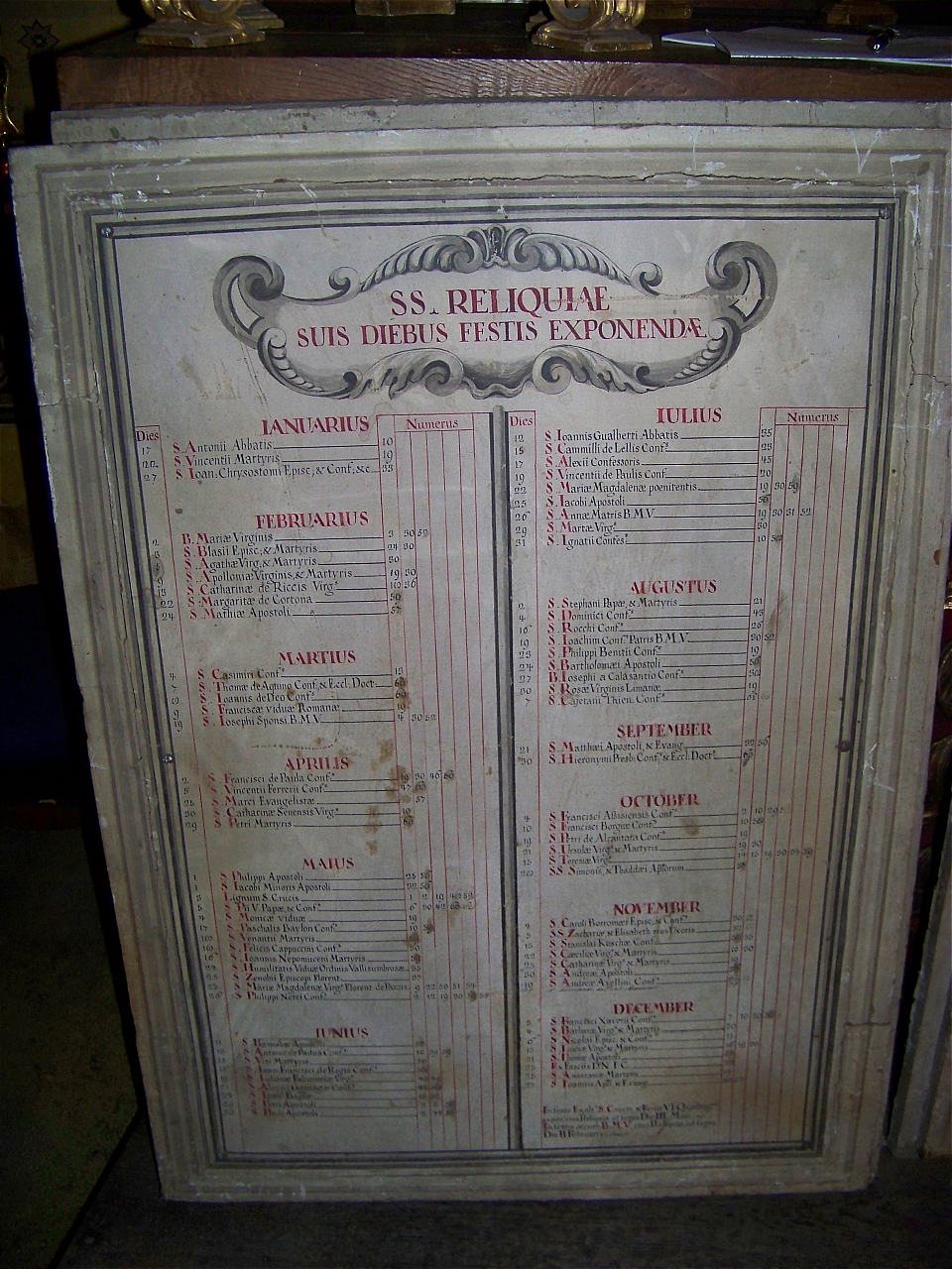 Due sportelli di armadio da reliquie con bordo modanato; sulle due facce sono incollati elenchi manoscritti di reliquie appartenenti alla cappella del palazzo