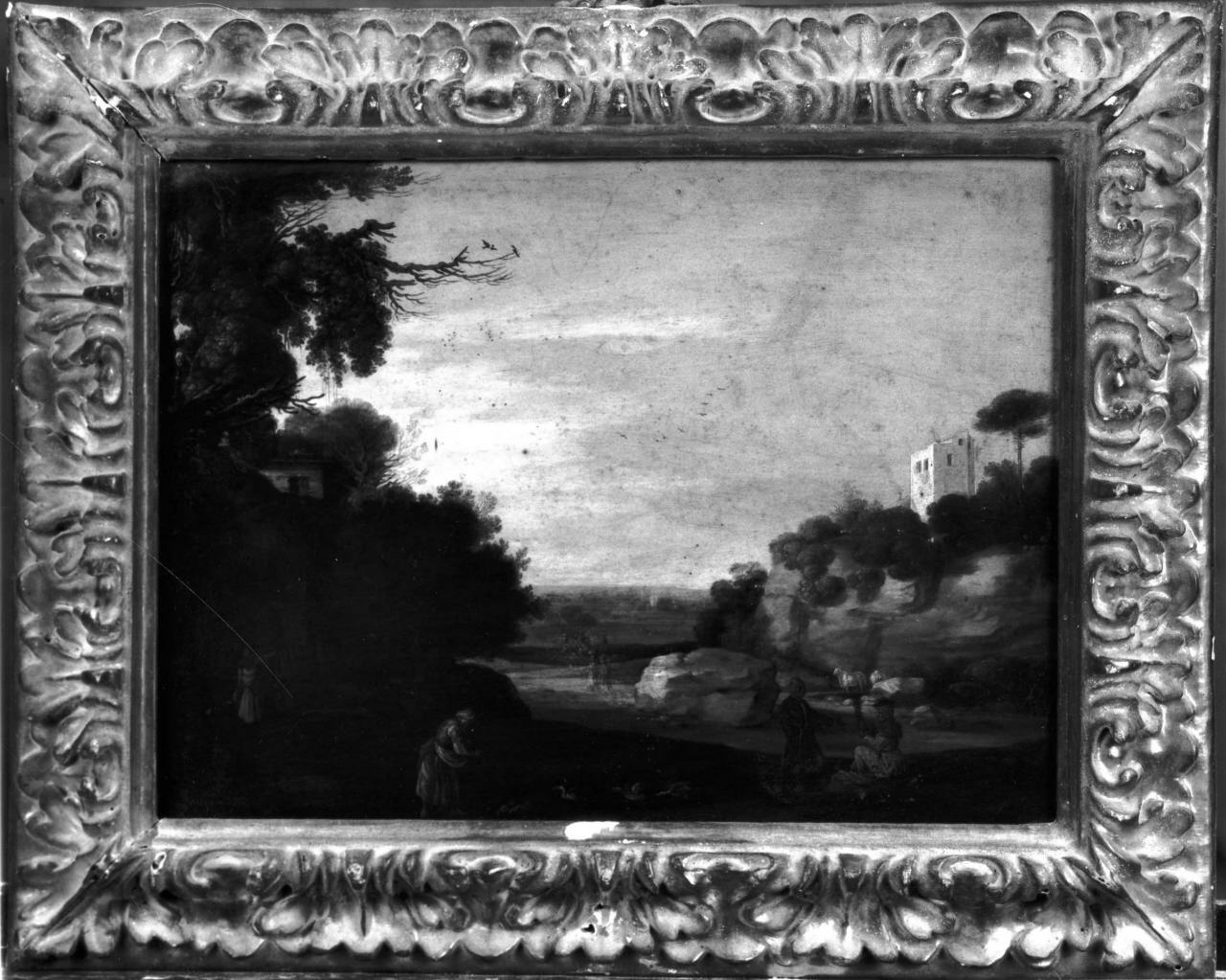 - NOTIZIE STORICO CRITICHE "I paesi di questa età… dal Baldinucci son chiamati dell'antica maniera. La nuova cominciò in Firenze da Filippo d'Angeli, o Filippo Napoletano…" (Luigi Lanzi). Il breve ma significativo giudizio del Lanzi è sufficiente a testimoniare la reale portata innovativa che Teodoro Filippo di Lagno (Liano), o D'Angeli come fu poi italianizzato il nome di famiglia (più comunemente detto dal Baglione in qua Filippo Napoletano) introdusse nella rappresentazione di paesaggi, genere artistico che dalla fine del XVI secolo poté godere in Italia e in Europa di grandissima fortuna. Portata innovativa che è sufficiente a inserire Filippo tra le personalità artistiche di maggiore rilevanza nel panorama artistico italiano di primo Seicento, non solo in questo genere pittorico ma anche nella rappresentazione delle battaglie, per le quali egli fu particolarmente famoso e ricercato. L'artista fu esponente di spicco del gusto di ispirazione nordica per dipinti di piccole dimensioni eseguiti su materiali preziosi come la lavagna, il diaspro, la pietra 'paesina', il rame, e raffiguranti, oltre ai paesaggi, marine, nature morte e scene di genere, e condivise grande fortuna e considerazione alla corte di Ferdinando I e di Cosimo II de' Medici con altri pittori forestieri quali Agostino Tassi e Jacques Callot. Gli studi condotti per molti anni da Marco Chiarini hanno contribuito in tempi recenti al progressivo chiarimento del profilo artistico dei tre maestri, talora confusi tra loro per l'affinità delle tematiche e del linguaggio. Gli anni passati da Filippo Napoletano a Firenze tra il 1617 e il 1621, al servizio di Cosimo II, furono di importanza fondamentale per la formazione dello stile di questo maestro geniale, che nell'ambiente fiorentino elaborò quelle spiccate caratteristiche di stile che hanno consentito di ricomporne attendibilmente il corpus pittorico. L'arrivo a Firenze del pittore, romano di nascita ma 'napoletano' di formazione, fu sicuramente determinato dalla fama di paesaggista ma anche di pittore 'di storia' tanto da divenire, dopo il suo arrivo a Roma nel 1614, 'familiare' del cardinale Francesco Maria del Monte e attraverso questi del cardinal Carlo de' Medici, fratello di Cosimo II. L'intensa attività condotta per il granduca, che lo inserì fin da subito nei ruoli della Guardaroba medicea con uno stipendio mensile, e per il fratello cardinale, porterà nella rappresentazione del paesaggio all'affermazione di uno stile nuovo, personale, nel quale rifluiscono le esperienza accumulate nel periodo napoletano-romano e alle quali si aggiungono progressivamente le nuove offertegli dall'ambiente fiorentino, particolarmente aperto, in quegli anni, ad accogliere dipinti di area nordica unitamente ad incisioni provenienti dall'ambiente fiammingo. L'adesione del Napoletano alla rappresentazione di un paesaggio 'naturale' di matrice elsheimeriana immette un ulteriore elemento di realtà nella cultura pittorica tra Firenze e Roma. I due importanti dipinti di proprietà Corsini costituiscono un pendant e sono assegnati a Filippo Napoletano ab antiquo, in virtù di una scritta sul retro del primo Paese. Vi si nota una evidente affinità con i dipinti del Napoletano provenienti dalle collezioni medicee ed oggi nella Galleria Palatina (depositi, inv. OdA 1911, n. 539) di Firenze, e pur nelle inevitabili varianti i due rami testimoniano la fortuna del soggetto presso i maggiori casati gentilizi fiorentini, che intendono corroborare la familiarità con la corte granducale anche attraverso un manifesto spirito di emulazione nel gusto artistico e nei favori accordati a certi generi pittorici. Pur nell'evidente clima elsheimeriano, i due piccoli dipinti sono soffusi da un alone pre-romantico che distingue certe opere del Napoletano una volta rientrato, dopo il 1622, a Roma. Nel complesso entrambi i rami di collezione Corsini, e soprattutto il secondo, dimostrano uno sviluppo nello stile dell'artista orientato a quel senso della realtà che si nota nelle opere del suo secondo soggiorno romano, dove emergono ricordi e suggestioni direttamente desunte dalla campagna che circonda l'Urbe, specie nelle boscose anse fluviali, o nei poetici ruderi turriti". Dott.ssa Giovanna Damiani, Soprintendenza SPSAE e per il Polo Museale della Città di Firenze