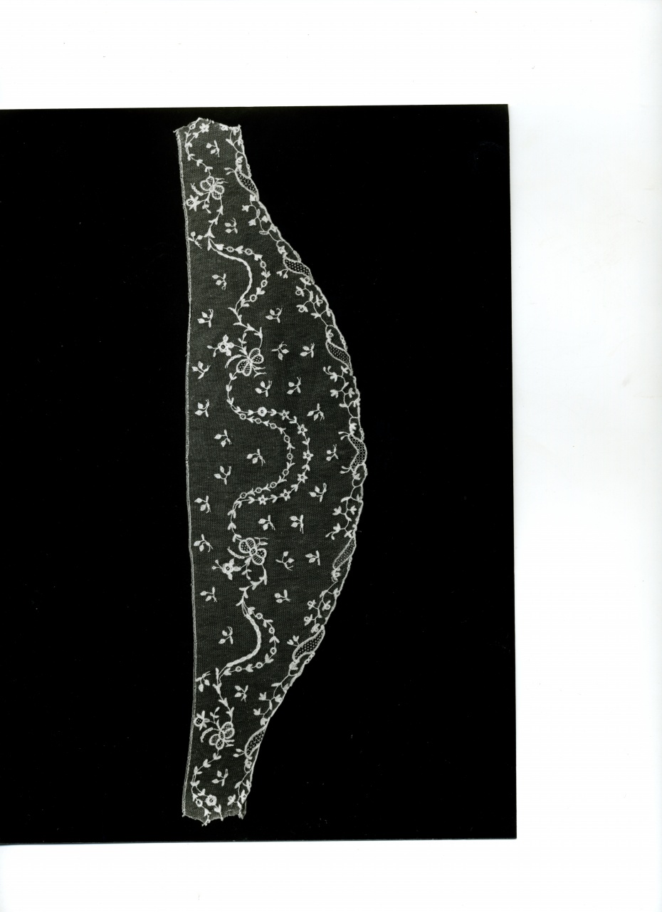 - NOTIZIE STORICO CRITICHE L'esemplare è uguale per tecnica e disegno all' inv: Stoffe 3352, e presenta il raffinato fondo noto con il termine "vrai drochel" (un perfezionamento del fondo precedentemente usato a Malines e a Bruxelles) che veniva lavorato in piccole strisce di cm.5 riunite poi,in fase finale, da un invisibile punto di raccordo; su di esso venivano lavorati i sottili motivi Luigi XVI che si fanno progressivamente più piccoli, tanto da imporre una fondamentale trasformazione tecnica:: negli anni tardi del secolo e poi nell'Ottocento non si eseguono più i decori contemporaneamente al fondo, ma si applicano motivi lavorati separatamente a fuselli. Questa nuova tecnica, definita come Application de Bruxelles, era delicata poiché il fondo doveva avere un'apparenza uniforme e non mostrare mani differenti e dunque richiedeva un'operaia specializzata (drosheleuse), le strisce venivano riunite da un'altra merlettaia (jointoise), i fiori da applicare erano attaccati da una differente lavorante (pointeuse), i motivi a fuselli erano eseguiti da altre due, una che si occupava delle parti solide (platteuse) e una che faceva le parti decorate e riempite (formeuse), infine i fiori erano imbiancati prima di essere applicati (striqueses). Le Application di Bruxellees rappresentarono non solo il segno della ripresa delle manifatture belghe, di Bruxelles, Gand,Alost, ma anche il perdurare della loro qualità straordinaria, messa ora al servizio di una assoluta novità, che avrebbe lasciato un segno importante nella produzione di tutto il secolo.. Nella mostra citata l'esemplare era stato presentato come acconciatura da testa, portando come esempio il ritratto di Therese di Braunnschweig fatto nel 1773 da De Gasc. In questo ritratto il merletto, messo ad incorniciare il volto lateralmente è arricciato in regolari pieghe forse leggermente inamidate. Questa acconciatura potrebbe accordarsi con le misure del nostro esemplare, ma poiché i finali sono incompleti, resta aperta anche l'ipotesi, suggerita dalla studiosa Anne Kraatz, che siano piuttosto engageantes, balze che venivano arricciate alle maniche, generalmente in più file