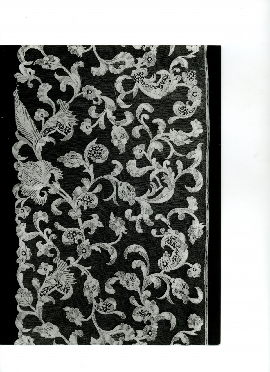 Lavoro ad ago in filato di lino con fondo a maglie esagonali allineate a scaletta in file parallele ad aussumere aspetto quadrangolare, fiori eseguiti a punto tela, occhiello, punti a giorno, reti a fondo di diamante con maglie regolari ad esagono con armelletta centrale unita ai lati da sei barrette, utilizzate anche come corolle. La balza presenta su un fondo a rete un motivo continuo di tralci ondulati da cui si dipartono, in varie direzioni foglie, fiori, grandi pigne. I motivi naturalistici e di invenzione sono fatti risaltare attraverso effetti di chiaro scuro dato alternando parti lavorate in modo molto serrato a parti più aperte, ottenuti con punti più radi o con l'uso di punti a giorno. I motivi sono disposti su tutta la superficie e si alternano in modo equilibrato con le aree a rete leggera, che fanno risaltare ulteriormente le soluzioni tecniche adottate