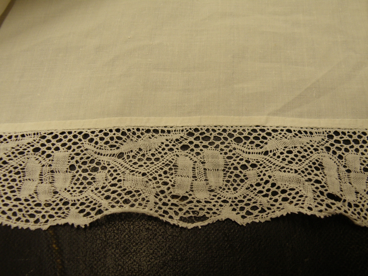 Tovaglia ornata su tre lati di trina a motivo floreale eseguito a punto tela