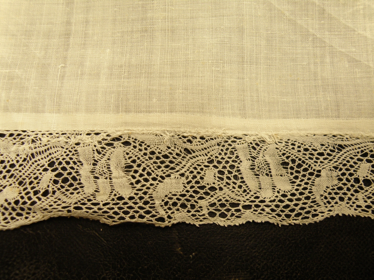 Tovaglia con scavo per il ciborio ornata su tre lati di trina a motivo floreale eseguito a punto tela e con iniziale coronata ricamata a filo rosso