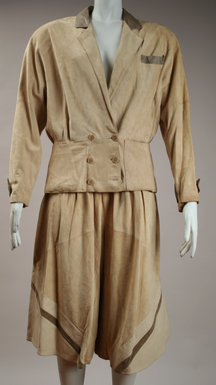 Completo femminile da giorno costituito da giacca e gonna-pantalone corta. Giacca a doppiopetto, con alta baschina ed effetto blusante al giro-vita. Sulla baschina, frontalmente, sono presenti tasche applicate trapezoidali, in corrispondenza dei fianchi; un altro taschino, con patta cucita in pelle grigia, è posizionato all'altezza del petto, a sinistra. Collo con risvolti a punte dritte. Maniche lunghe, a pala bassa, dal taglio diritto, dotate di martingale in pelle grigia ai polsi, fermate da bottone (2 per polso). Chiusura con bottoni analoghi ai precedenti (6), e 3 occhielli a filetto (sulla mostra destra). Internamente, in corrispondenza di ciascun bottone, sono stati cuciti, a rinforzo del tessuto, altrettanti bottoni trasparenti a quattro fori; al punto vita, è presente un ulteriore bottone con asola a filetto (sulla sinistra). Interamente confezionata in pelle scamosciata color beige chiaro. Fodera in taffetas tinta tortora. Sono presenti imbottiture in corrispondenza delle spalle. All'interno della mostra sinistra è presente un'etichetta che ne attesta la provenienza sartoriale