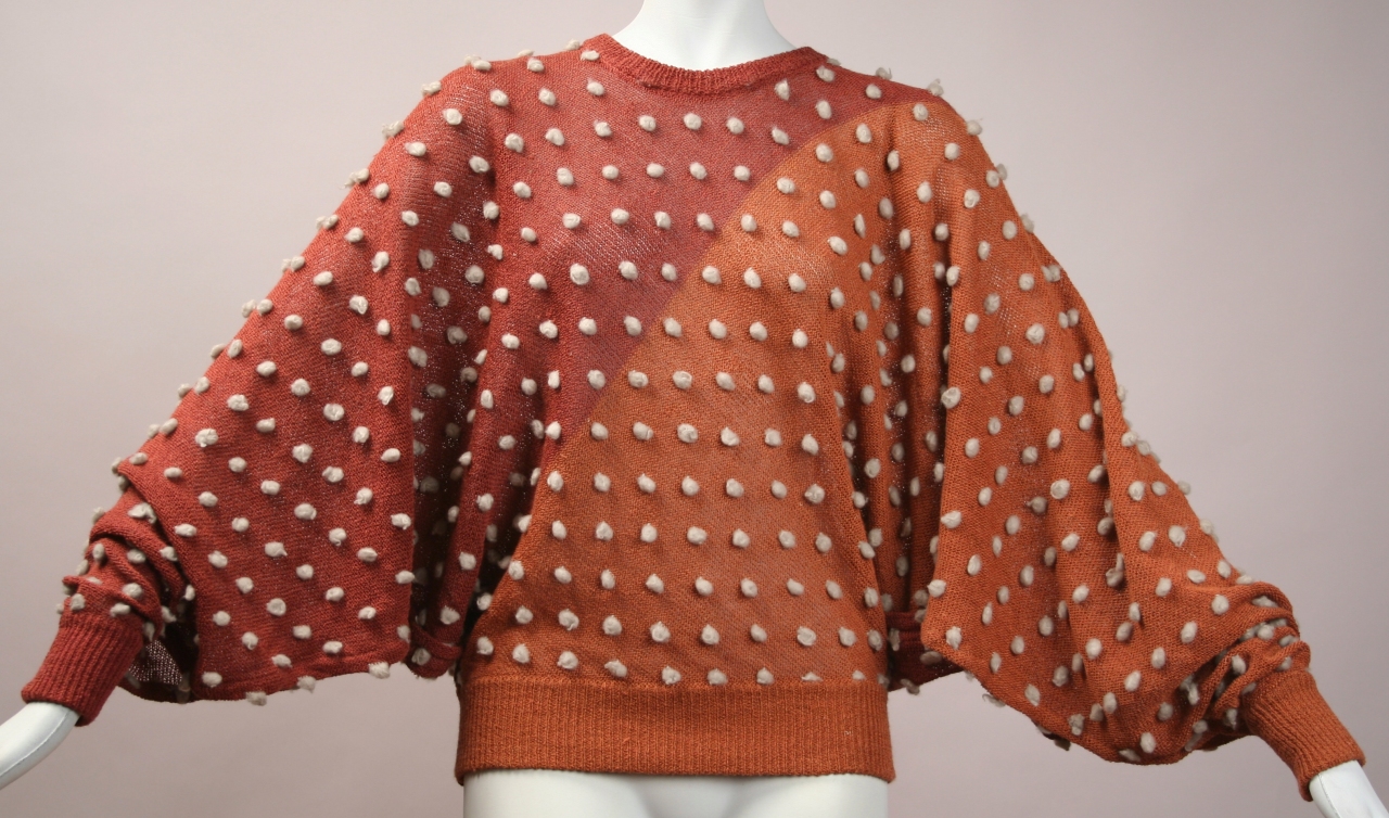 Maglione a girocollo, con maniche lunghe a pipistrello, aperte da ampi spacchi in corrispondenza del sotto-braccio (cm 37); corto in vita, con cinturino e polsini di maglia doppiati. Interamente realizzato con filato di lino misto poliestere lavorato a maglia rasata (nei colori arancione e rosso mattone), con inserti in lana bianca a rilievo, ad effetto pois; su tutto il capo, il tessuto di maglia rasata è utilizzato a rovescio. Sul centro dietro dello scollo è presente un'etichetta che ne attesta l'origine sartoriale