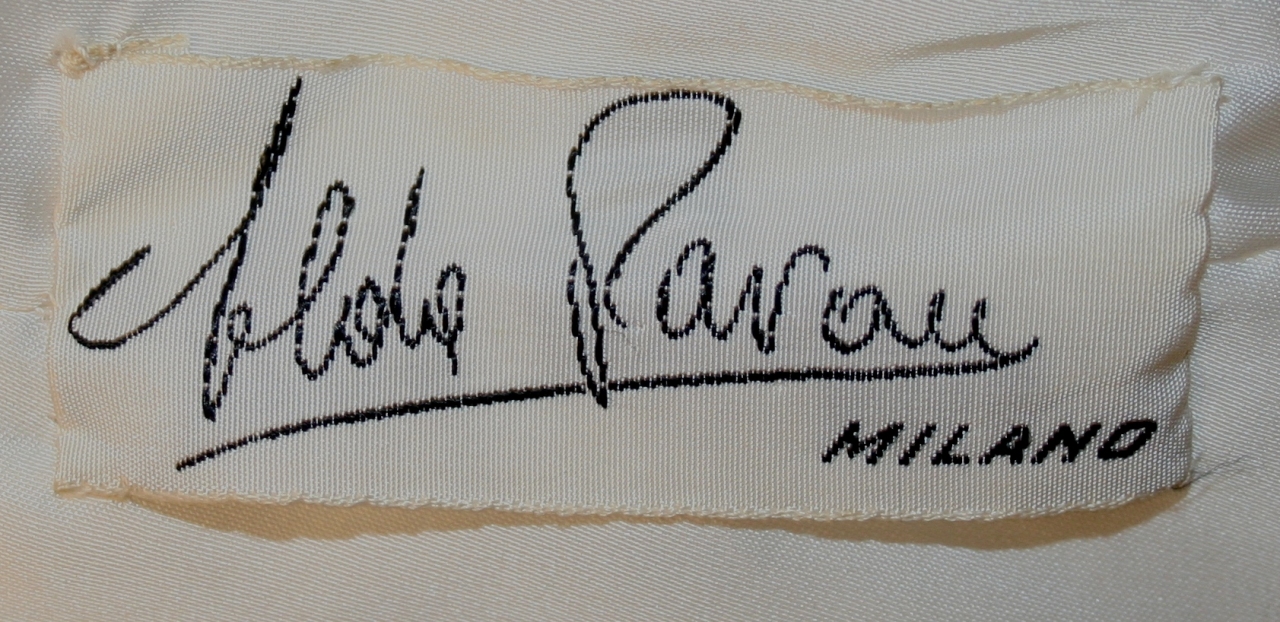 - NOTIZIE STORICO CRITICHE Il completo in oggetto è appartenuto alla scrittrice fiorentina Anna Rontani, il cui guardaroba di haute couture è stato recentemente messo all'asta dalla Casa Bibelot di Firenze (25 Ottobre 2012). Donna di grande fascino e personalità, coltivò anche una certa passione per viaggi e crociere che la portò, nel corso di una vita, a raccogliere un guardaroba a dir poco sontuoso. Trattasi di modello della creatrice di moda Elda Pavan, di origini venete, tra le personalità di maggior spicco nel panorama della moda italiana a partire dalla fine degli anni '60. Il suo approccio al mondo della couture è da autodidatta, e la vede dapprima quale titolare di una modisteria a Viareggio. Giunge in seguito ad ampliare significativamente l'attività, tanto da inaugurare un atelier in Via Borgonuovo a Milano, nel 1968 (quasi contemporaneamente, veniva aperto un laboratorio sartoriale anche a Saronno). Il successo riscosso in quegli anni è testimoniato dal conseguimento di premi prestigiosi (come l'Oscar della Moda a Sanremo, nel 1972), e dall'apprezzamento dimostrato nei suoi confronti da una clientela di caratura internazionale (in special modo giapponese). Quanto al completo in oggetto, l'etichetta riscontrata ne riconduce la fattura all'atelier milanese (che chiuse già nel 1970, a causa di un grave lutto familiare). Per quanto riguarda invece la sede di Saronno, la produzione continuerà sino alla metà degli anni '90. Per ulteriori informazioni si rimanda alla bibliografia di riferimento (Donne protagoniste nel Novecento, Sillabe 2013)