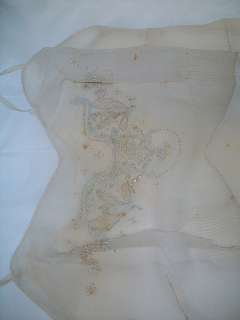 Sottabito femminile lungo al ginocchio, sfiancato, di linea leggermente svasata, con punto vita rialzato; sorretto da spallini sottili in organza di seta. Plissettatura decorativa, fermata a punto filza, posizionata nella parte anteriore del corpino (lateralmente, sotto al seno); pinces sul seno. La parte posteriore dell'intero capo e quella anteriore della gonna sono confezionate in organza di seta color panna, mentre la parte anteriore del corpino è realizzata in crêpe di seta dello stesso colore, ricamato a "punto ombra" (punto incrociato con retro orizzontale, lavorato a rovescio), punto passato e ad effetto sfilato: motivi vegetal-floreali (fiori d'arancio o margherite) accompagnati da elementi a volute e cartigli, eseguiti in filato di seta bianco avorio (2 capi, Z)