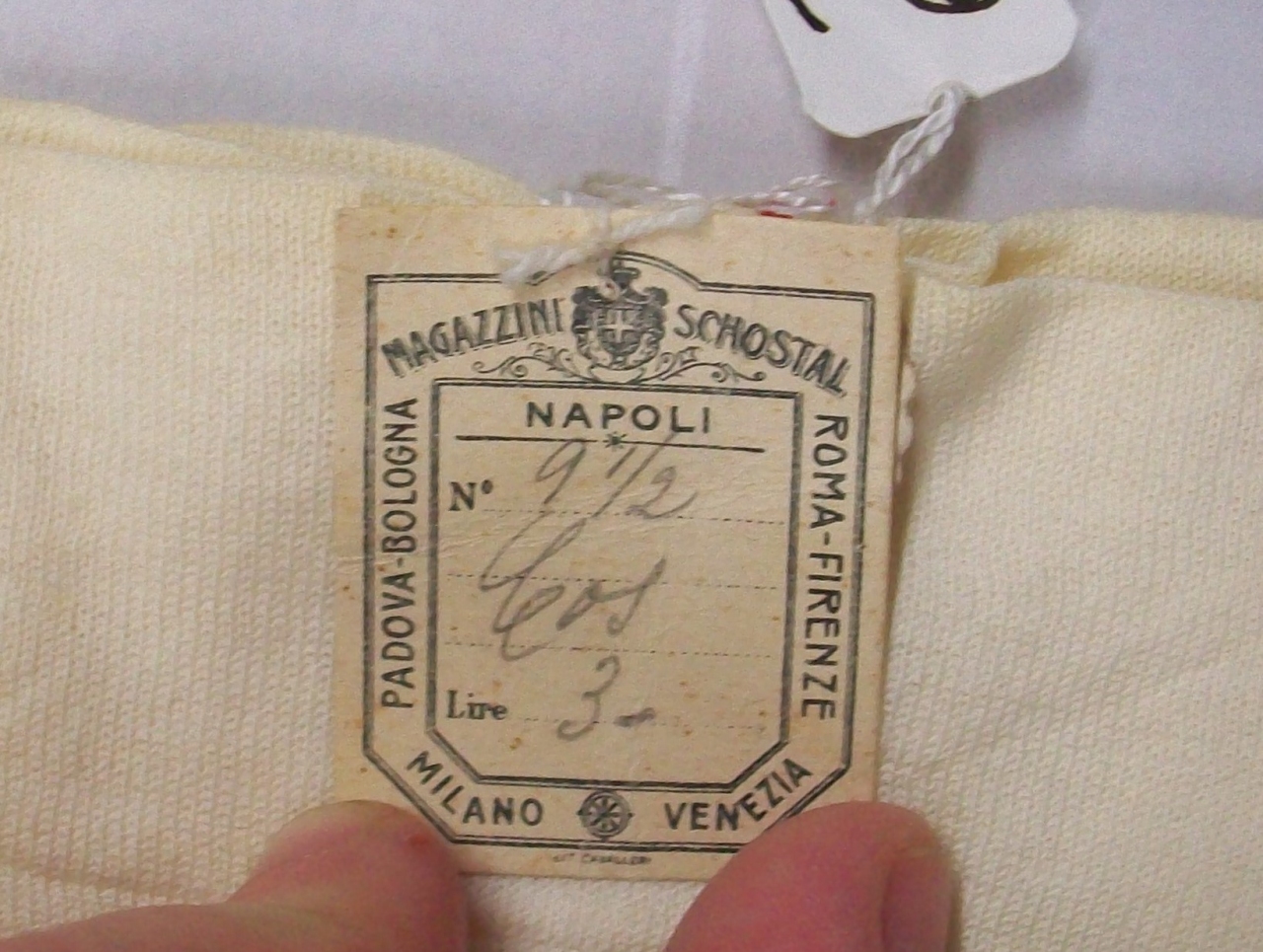 - NOTIZIE STORICO CRITICHE Le calze in oggetto sono state donate assieme ad un abito (di possibile sartoria potentina, o più probabilmente napoletana) indossato dalla Sig.ra Emma Postiglione in occasione del suo matrimonio con Francesco Saverio Scerre, dottore in medicina, celebrato il 23 giugno 1910 presso la dimora della sposa, com'era d'uso allora presso le famiglie abbienti. Probabilmente mai indossate, recano ancora l'etichetta che ne riconduce la fattura alla ditta Schostal di Vienna, specializzata nella confezione di biancheria ed abbigliamento intimo. Il primo punto vendita italiano fu aperto a Roma nel 1870; seguirono poi quelli di Milano, Firenze, Bologna e Napoli (dove furono acquistati gli esemplari in esame). La sede di Roma è a tutt'oggi aperta, al n. 29 di Via Fontanella Borghese