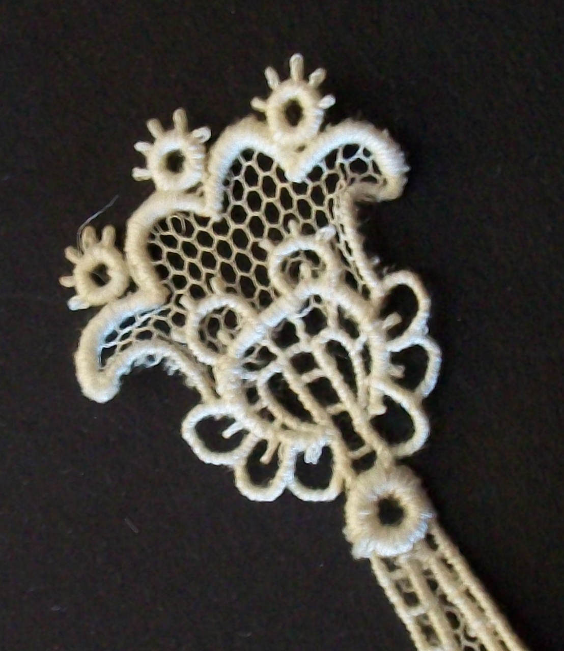Elemento pendente appartenente, con probabilità, ad un colletto del tipo "rabat", realizzato in merletto chimico di cotone bianco, su base di ricamo meccanico eseguito su fondo tulle (del tipo Bobbinet): all'apice, fiore a campanula con cravattino applicato, recante un tralcio sinuoso con infiorescenze rigogliose su fondo tulle; all'estremità, grossa infiorescenza su campo dal profilo festonato, con fondi variati per ciascuno dei petali (a maglie esagonali, quadrate, con occhielli, irregolari con picots)