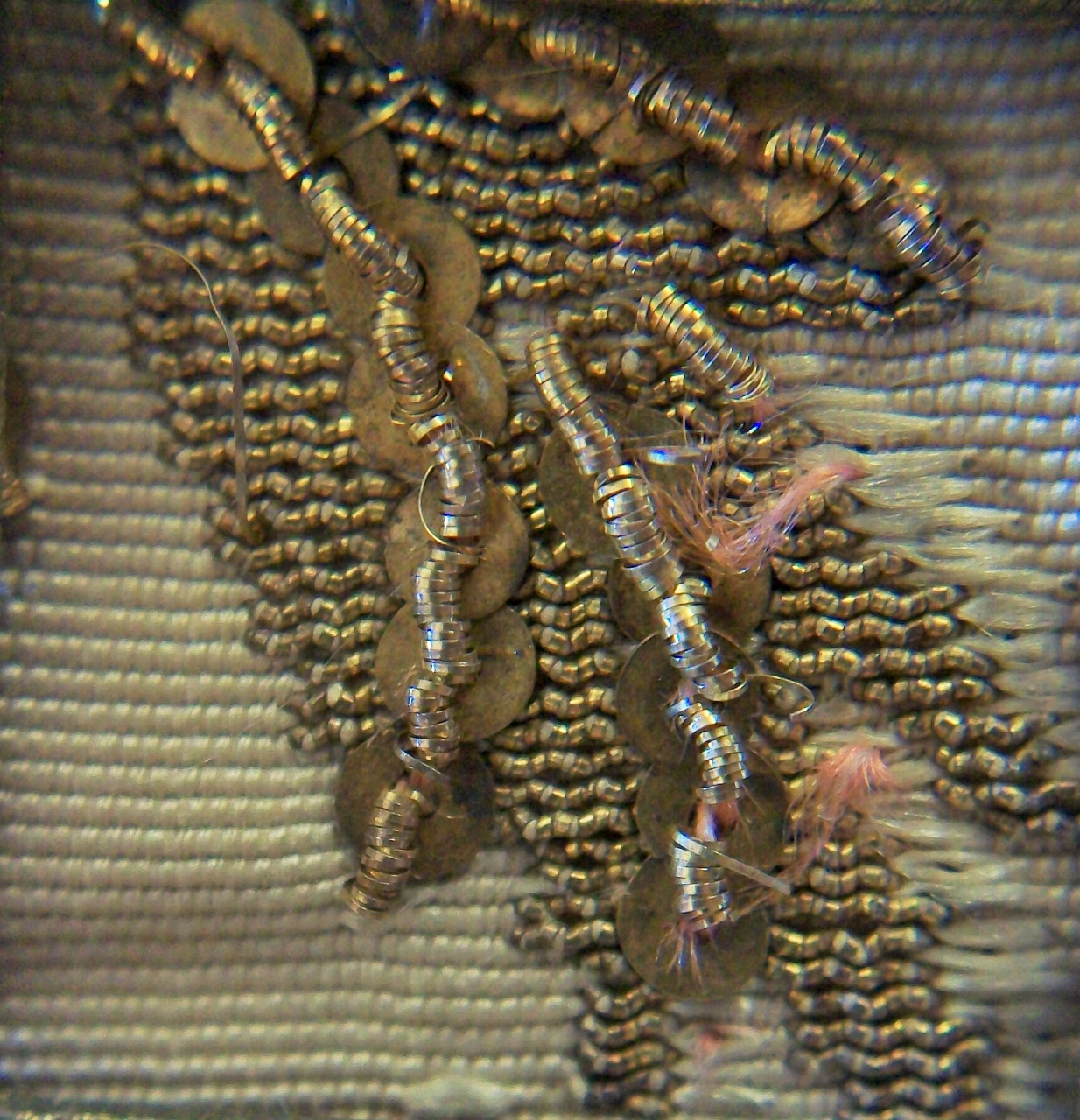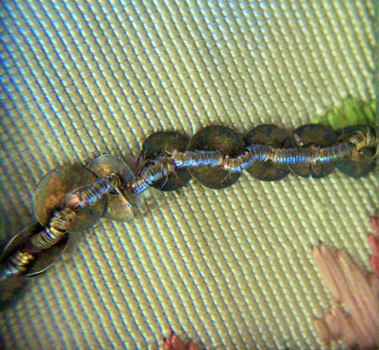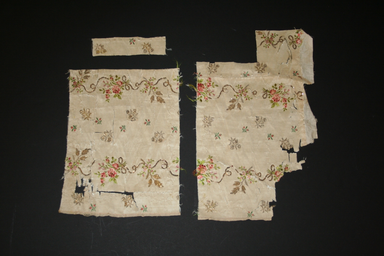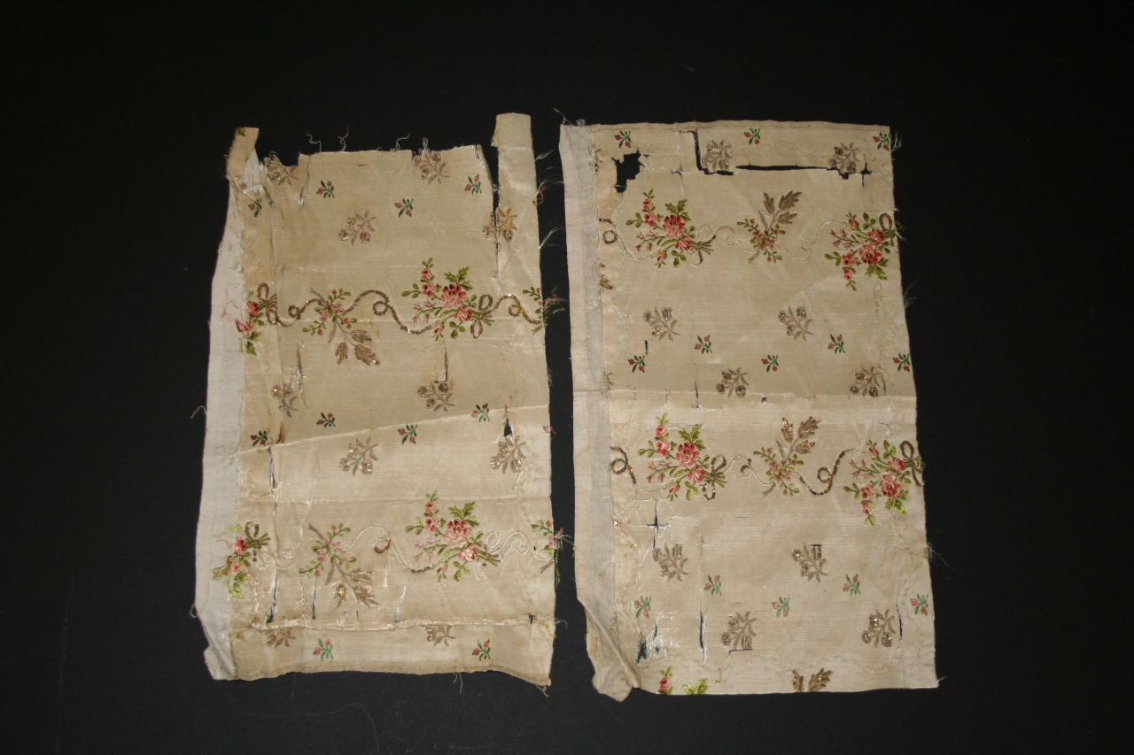 Trattasi di 12 pezze di tessuto per abbigliamento femminile, in lousine di seta color crema, broccata in sete policrome, argento riccio, riant (detto anche "filato sorbée") su anima in seta rosa, e lamellare; lavorazione a ricamo mediante applicazione di paillettes in rame dorato, fissate a punto indietro con canutiglia dorata a sezione circolare (inserita al dritto, tra i punti di legatura): sparsi con regolarità nel fondo, piccoli bouquets di rose canine, collegati da nastro sinuoso, a sviluppo verticale; negli spazi di risulta, minuti tralci con fiori in boccio