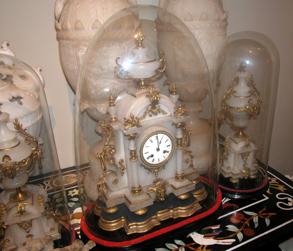Orologio in alabastro bianco con decorazioni dorate, completo di base ovale in legno accato nero e campana di vetro