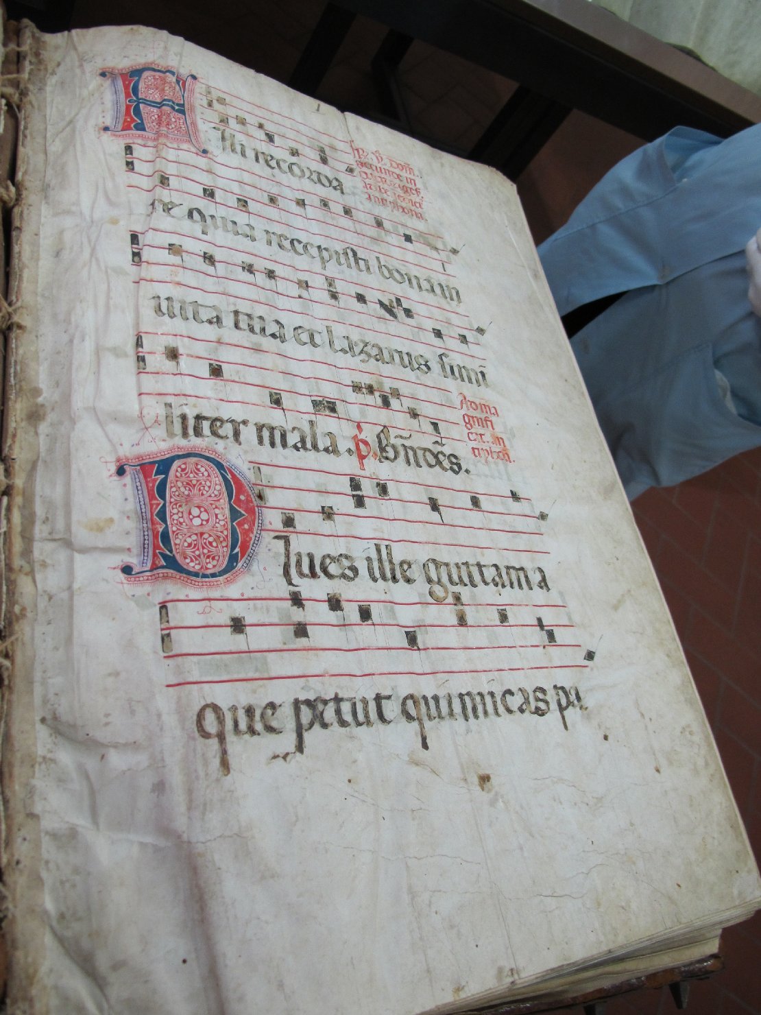 - NOTIZIE STORICO CRITICHE Il corale fa parte del nucleo di corali eseguiti per la Primaziale e conservati in cattedrale in un armadio, come riporta la Dalli Regoli (1986, p. 148), "situato presso il presbiterio". Nel 1963 risulta conservato presso la Biblioteca Capitolare (Dalli Regoli, 1963, p. 90). Il Papini (1912) ascrive l'illustrazione del Corale ad un maestro attivo nella seconda metà del XIV secolo di ambito fiorentino. Il Salmi (1954) lo assegna ad un maestro di scuola senese della seconda metà del secolo XIV riscontrando grandi affinità con la pittura senese contemporanea soprattutto con quella di Pietro Lorenzetti. La Dalli Regoli (1963, 1986) invece riconosce un maestro di ambito pisano, che chiamerà Maestro primo, l'autore delle miniature di questo corale e anche di quelle dei corali A.2 e E. 8. Secondo la studiosa l'anonimo maestro doveva risiedere stabilmente a Pisa, dove lavorava sia per le comunità religiose (Opera Primaziale, convento di San Francesco) che per i magistrati comunali (Archivio di Stato di Pisa, mss. Com. A. 15 e Com. A. 18). Il Maestro, che operava all'interno di una sigla stilistica ben riconoscibile, doveva appartenere ad un'officina che aveva molti punti di contatto con la cultura figurativa della prima metà del Trecento (figurine asciutte con vesti dai segni composti, capigliature compatte, volti dai lineamenti marcati), in cui venivano unite in un equilibrio perfetto sia forme senesi che fiorentine avendo però un punto di riferimento determinante in Francesco Traini e nella tradizione pisana dei pittori attivi nel Campo santo. Dalla cultura lorenzettiana eredita la sobrietà e la compostezza de +lle figure riscontrabile anche nell'unica grande miniatura figurata presente in questo corale, "Le Marie al sepolcro", dove la rapida scalatura dei piani, la collocazione delle tre donne poste una dietro l'altra e la gamma cromatica dei colori particolarmente sobria, sottolinea ulteriormente l'austera intenzione compositiva. Sono invece, pur mantenendo uno stile personalissimo, di chiara derivazione dei moduli presenti nel Camposanto pisano, i vari essere fantastici presenti nelle "droleries" dei fregi che ornano tutte le lettere miniate