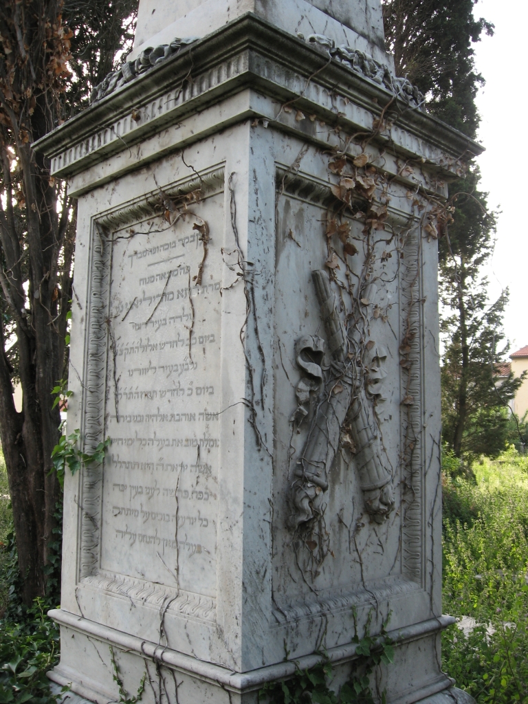 - ISCRIZIONI occupa tutta la specchiatura anteriore - QUI SI NASCOSE / IL FRANCO E BEL VOLTO / DI / ROSINA MODIGLIANI / LE CUI V IRTU' LETIZIARONO / AMATA E RIAMANTE FAMIGLIA / E SOLLEVARONO / LE MISERIE DEL POVERO / FECE PER XXV ANNI / DOLCE ED INVIDIABILE / LA VITA AL MARITO / ALBERTO MODIGLIANI / CHE PERDUTALA / NON HA CONFORTO / NAQUE IN ROMA / IL VI SETTEMBRE MDCCCXXXIII / MORI' IN LIVORNO / IL XXX GIUGNO MDCCCLXXVII - caratteri ebraici -