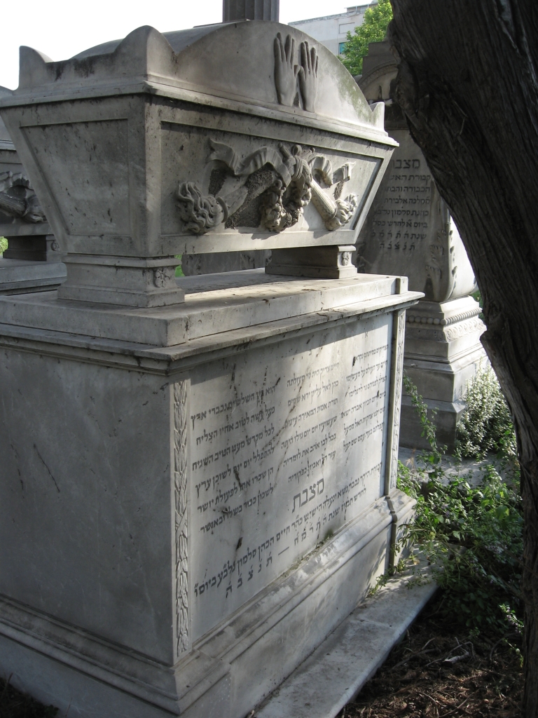 - ISCRIZIONI occupa tutta la specchiatura anteriore - IL GIUSTO SPOLTO DEL MORTALE INVOLUCRO / GODE VITA ETERNA / SPICCA IL VOLO AL CIELO PRECEDUTO DALLA VIRTU' / LASSU' CANTA LE LAUDI DI DIO / LO IMPLO RA FIDENTE PER QUELLI CHE AMA / VITA COEN SALMON / GIUSTO PIO / CERCO' DIL ETTO NELLA LEGGE DEL SINAI / NE AMO' I CULTORI / POVERO, ORFANO, VEDOVA GE NEROSO BENEFICO' / CONSIGLIERE DELL'UNIVERSITA' ISRAELITICA / FU RETTO ED EQUO / I SACRI ORATORJ CON ZELO AMMINISTRO' / COLMO' DI DONI / HA LASSU' C ONDEGNO GUIDERDONE / LIETO E BEATO RIPOSO / MORI' IL 15 GIUGNO 1888 - caratteri ebraici -