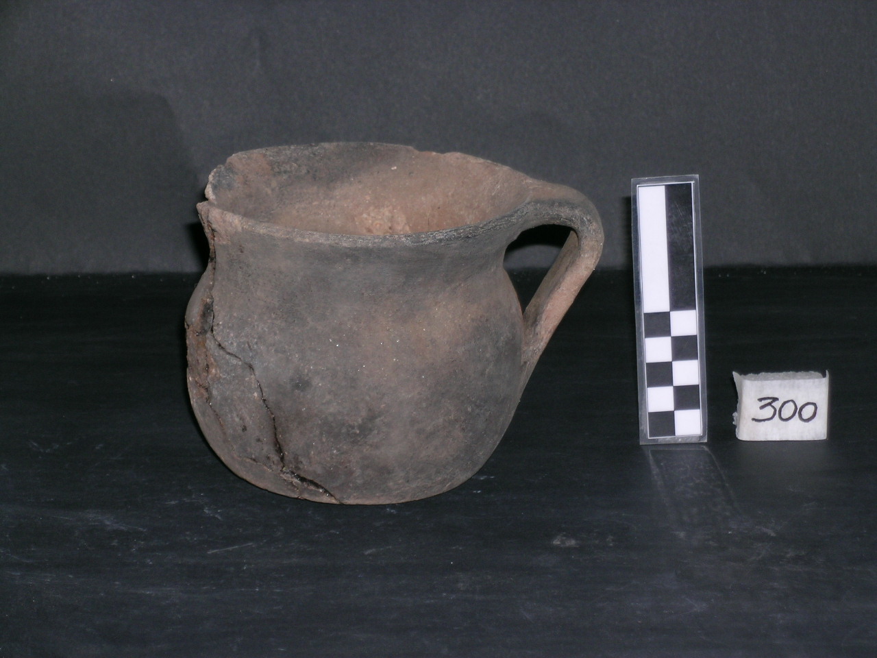 Pentola con orlo estroflesso e tagliato, corpo globulare, fondo concavo. Superfici lisciate con un panno, ansa a nastro impostata sotto l'orlo. Priva di rivestimento