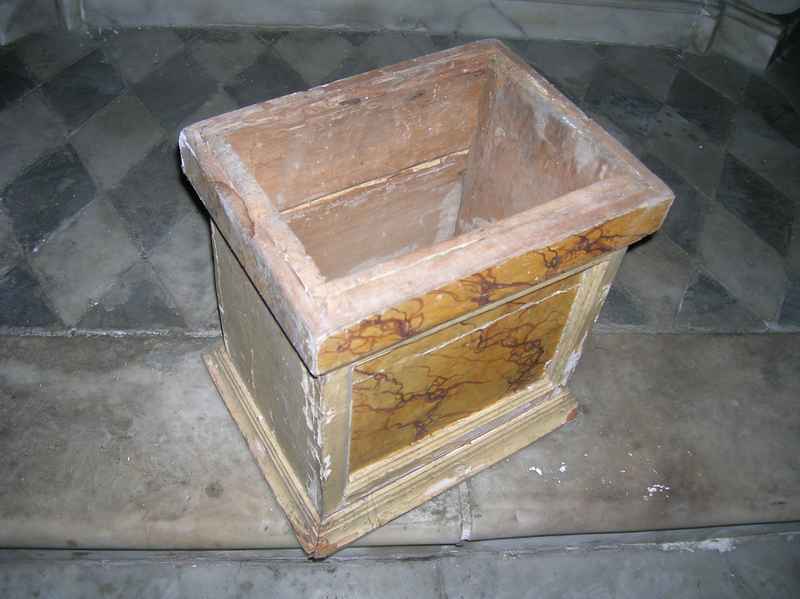Le basi sono dipinte esternamente in bianco, poggiano su una cornice modanata e sono delimitate in alto da una cornice sporgente decorata con marmorizzazione marrone. La faccia anteriore presenta un riquadro con profilo modanato e superficie marmorizzata in marrone. Le basi sono vuote internamente