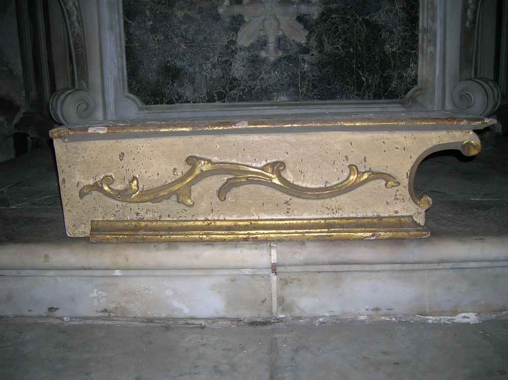 Complesso decorativo costituito da un gradino centrale e due laterali (quello a sinistra è perduto), decorati con intagli dorati su fondo bianco