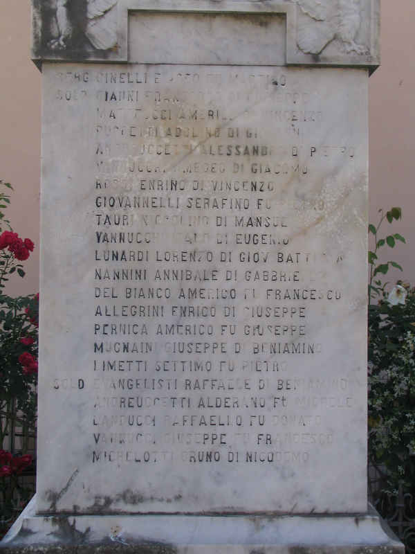 - NOTIZIE STORICO CRITICHE Nel settembre 1926, su richiesta del comitato locale, la Giunta Municipale del Comune di Lucca deliberò l’atto di acquisto di un terreno posto di fronte alla chiesa per erigervi un monumento ai caduti. Di lì a breve (non si ha una datazione certa) fu inaugurato il monumento. I caduti menzionati nell'Albo dei Caduti della Grande Guerra (http://www.cadutigrandeguerra.it/) sono: Cinelli Eliseo, Gianni Francesco, Matteucci Amerigo, Andreuccetti Alessandro, Giovannelli Serafino, Vannucchi Italo, Lunardi Lorenzo, Nannini Annibale, Del Bianco Americo, Mugnaini Giuseppe, Limetti Settimo, Evangelisti Raffaele, Andreuccetti Alderano, Vannucci Giuseppe. Bib.: Delibera della Giunta Municipale di Lucca del 17 settembre 1926