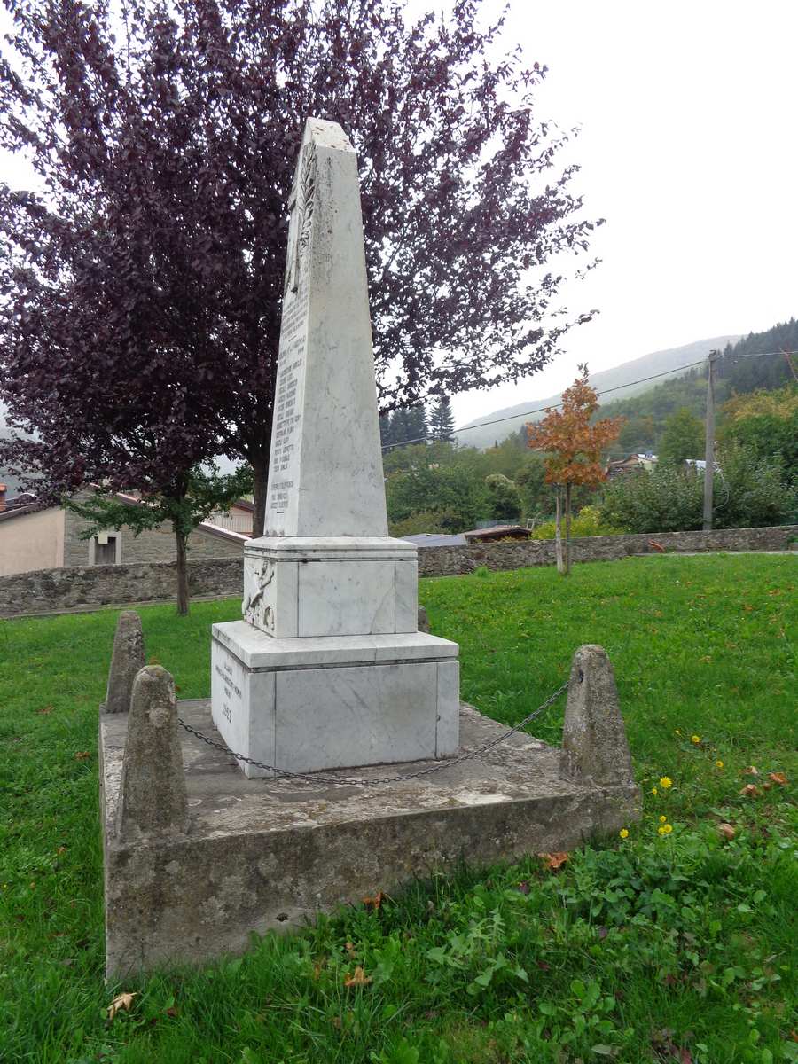 - ISCRIZIONI frontalmente al centro - ALLA MEMORIA DEI NOSTRI CARI/ CONCITTADINI CHE COL PENSIERO/ E COL SACRIFICIO DELLA LORO VITA/ CONTRIBUIRONO ALL’INDIPENDENZA/ E ALL’UNITA’ DELLA PATRIA/ GUERRA ITALO – AUSTRIACA/ 24 – 5 – 915 – 3 – 11 – 918/ LUCCHESINI AURELIO/ CODINI LUIGI/ REGALI AMBROGIO/ AGUZZI MASSIMO/ CASINI DOMENICO/ REGALI ADRIANO/ GUIDETTI PIETRO GIOV.NI/ BERTOLINI PLINIO/ ANGELI LUIGI/ VENCHI LEONETTO/ BOSI PASQUALE/ CODINI EMILIO/ GUERRA ITALO- TURCA/ POLI DOMENICO/ AGUZZI ALBERTO - capitale - a incisione -