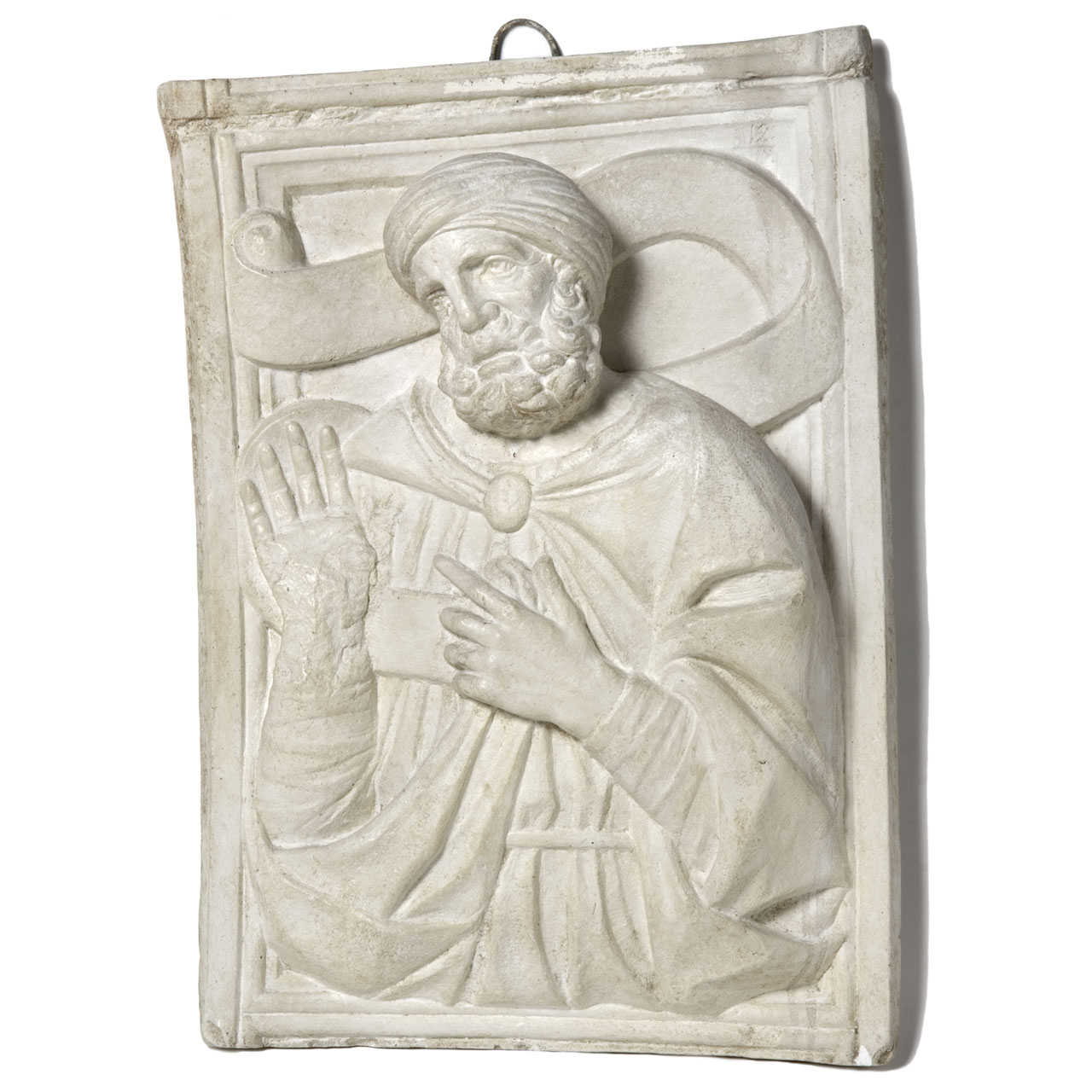 - NOTIZIE STORICO CRITICHE Il calco venne eseguito per essere esposto alla mostra dell'Antica Arte senese del 1904, col fine di far ammirare ai visitatori i capolavori scultorei degli artisti senesi realizzati anche fuori Siena (L. Pacchiarotti, 2005). Le decorazioni scultoree del portale maggiore vennero realizzate quasi interamente da Jacopo della Quercia, ma il rilievo in esame rappresenta una delle formelle poste nello sguancio della lunetta scolpite nel Cinquecento da Antonio del Minello e Antonio di Domenico da Ostigia. I profeti non sono identificabili ma la loro diversità è ampiamente documentata nelle caratteristiche fisiche ed emotive. Questo in esame è l'undicesimo profeta della lunetta attribuibile a Antonio di Domenico da Ostigia (A. Matteucci, 1966)