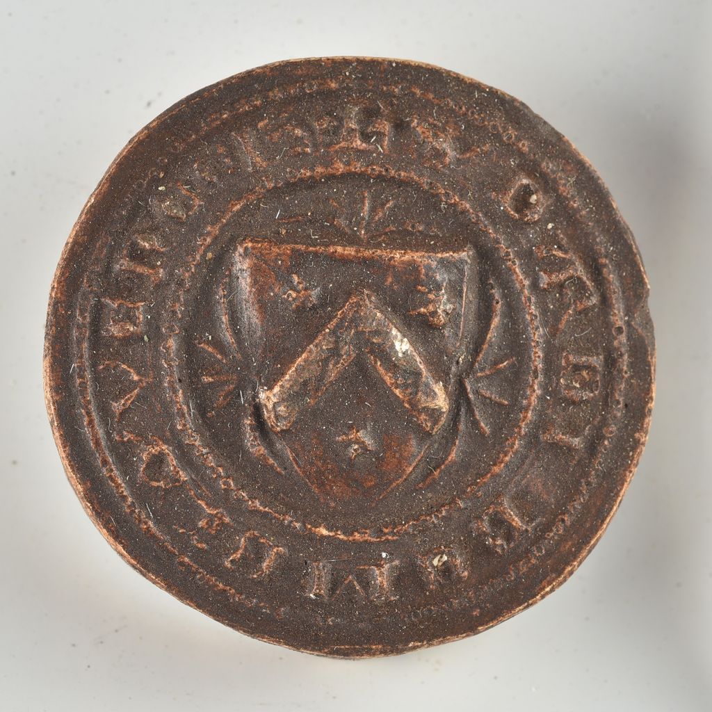 Forma circolare. Legenda gotica circondata da doppia coroncina globulare. Nel campo è presente uno stemma