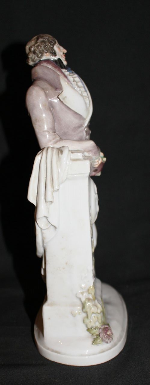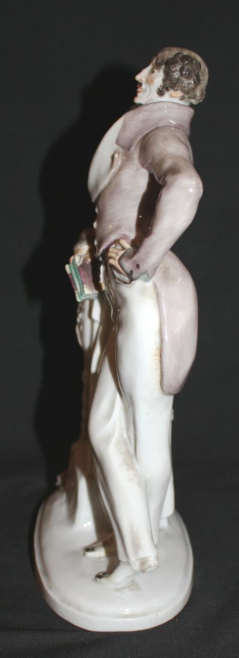 - NOTIZIE STORICO CRITICHE L'esemplare appartiene alla collezione del sacerdote Giacomo Laguzzi, da lui stesso donata il 17 agosto 1943 all'allora R. Soprintendenza alle Gallerie per le provincie di Firenze Arezzo e Pistoia (vedi Verbale con l'elenco delle opere consegnate, dove la siglatura alfa numerica associata alle singole voci corrisponde a quella indicata sull’etichetta apposta su ciascun esemplare). La collezione fu depositata a Palazzo Pitti presso il Museo degli Argenti (ora Tesoro dei Granduchi), dove fu esposta dopo gli eventi bellici e successivamente trasferita nella guardaroba della Galleria d'Arte Moderna. Essa è costituita da centotré miniature su lastre in porcellana aventi in prevalenza come archetipi dipinti, da venticinque piatti (dodici appartenenti a una serie con raffigurate scene ispirate alle opere di Richard Wagner e i rimanenti decorati con raffigurazioni di gusto naturalistico o tratte da dipinti di maestri dei secoli precedenti) e ancora da sessanta esemplari tra statuette, scatole, vasi e gruppi scultorei. Sempre per volontà del Laguzzi, a questo nucleo sono stati aggiunti nel 1946 alcune miniature, sempre su lastra in porcellana. L'esecuzione dei manufatti che formano questa raffinata e variegata raccolta è prevalentemente riconducibile alle fabbriche di porcellane attive a Dresda, ma anche in Turingia (vedi il marchio di fabbrica presente su quasi tutti gli esemplari), ed è databile tra la fine dell'Ottocento e non oltre il 1942, in riferimento all’anno della sua donazione. Questa collezione vanta anche la presenza della principale manifattura di porcellane tedesca, quella di Meissen fondata nel 1710 da Augusto il Forte, Elettore di Sassonia e re di Polonia. Il nucleo riunito dal Laguzzi è costituito da ventotto sculture, come rivelato dalla presenza su di esse del marchio con le due spade incrociate. Vi sono soggetti rappresentativi della produzione di questa fabbrica, quali gli animali, ma anche in linea con il gusto dell’epoca e quindi comuni ad altre manifatture di porcellane, come le riduzioni dalla statuaria antica, le figure allegoriche, oltre ai putti e ai fanciulli di gusto arcadico pastorale e ancora a gruppi con scene galanti, allegoriche e mitologiche. Nonostante la comunanza di generi, le sculture di Meissen sono riconoscibili per la raffinatezza del modellato, per il candore della porcellana e per il raffinato decoro pittorico, dove presente. Il marchio di fabbrica è riprodotto in blu sottovernice prevalentemente al di sotto della base e in genere è accompagnato da sigle impresse nella pasta prima della cottura, tra cui quella solitamente alfa numerica identifica il modello dell’esemplare rappresentato, mentre l’altra è ipoteticamente da ricondurre alla maestranza che l’ha eseguito. In taluni casi, sugli esemplari in policromia vi è anche un numero realizzato a pennello, forse da riferire al decoratore. La presenza nella collezione Laguzzi di esemplari di Meissen non decorati trova giustificazione con i soggetti rappresentati di gusto antiquario o allegorici, ad eccezione di una fanciulla che gioca con un cagnolino e di un orientale danzante, che richiama le “chinoiserie” eseguite nella fabbrica fin dai primi anni di attività. La statuetta raffigurante un “Geck” (damerino, spavaldo) è stata ideata in coppia con la gentildonna in atteggiamento dimesso e pensieroso denominata “Biedermeierdame” (vedi “The Opulent Eye & Carpets”, catalogo di vendita Christie’s, New York, 26 novembre 2013, lotto 2748). L’invenzione di entrambe le figure in piedi accumunate dalla medesima posa in controparte si deve allo scultore, pittore e grafico Paul Scheurich (New York, 1883 - Brandenburg an der Havel, 1945), che tra il 1900 e il 1902 si formò all'Accademia di Berlino. Tra gli anni Venti e gli anni Trenta intraprese la sua collaborazione per la Manifattura di Meissen, all’epoca diretta da Max Adolf Pfeiffer, che nel 1939 seguì a Königliche Porzellan-Manufaktur (KPM), dove ne acquisì la direzione. Fu ritenuto uno dei principali modellatori in porcellana della prima metà del Novecento e a lui si deve la creazione di oltre cento modelli (vedi “Meissner Manuskripte”, VIII, pp. 34,35; J. Rafael, “Paul Scheurich, 1883-1945. Porzellane für die Meissener Manufaktur”, Meissen 1995). Sotto la base del nostro esemplare è impressa la sigla “F 235” riscontrabile anche sulle altre statuette con questo soggetto, a conferma che si tratta del numero di modello, il quale però non è consequenziale a quello della figura in pendant (“F 241”). Ciò porta a ipotizzare che il “Geck” inizialmente sia stato pensato come soggetto singolo. Degli altri numeri solamente il “74”, segnato a pennello, è presente su entrambe le figure della coppia illustrata nel catalogo on-line della Sabet Antiquitäten di Berlino, dove peraltro nella fanciulla all’altezza del basamento della colonna è visibile la firma dello scultore “Paul Scheurich” (vedi https://sabet-antik-berlin.de/meissen-figurenpaar-biedermeierdame-und-geck-prof-paul-scheurich/, consultato 30/6/2020). La numerazione a pennello potrebbe essere riferita al decoratore, poiché a differenza della sigla che indica il modello e che è costante sulle versioni poste a confronto, essa risulta, ad esempio, variata in “69.” su un’altra replica del nostro esemplare (vedi https://www.1stdibs.com/furniture/dining-entertaining/porcelain/finest-meissen-porcelain-figurine-dude-paul-scheurich-circa-1919/id-f_18790772/, consultato 30/6/2020)