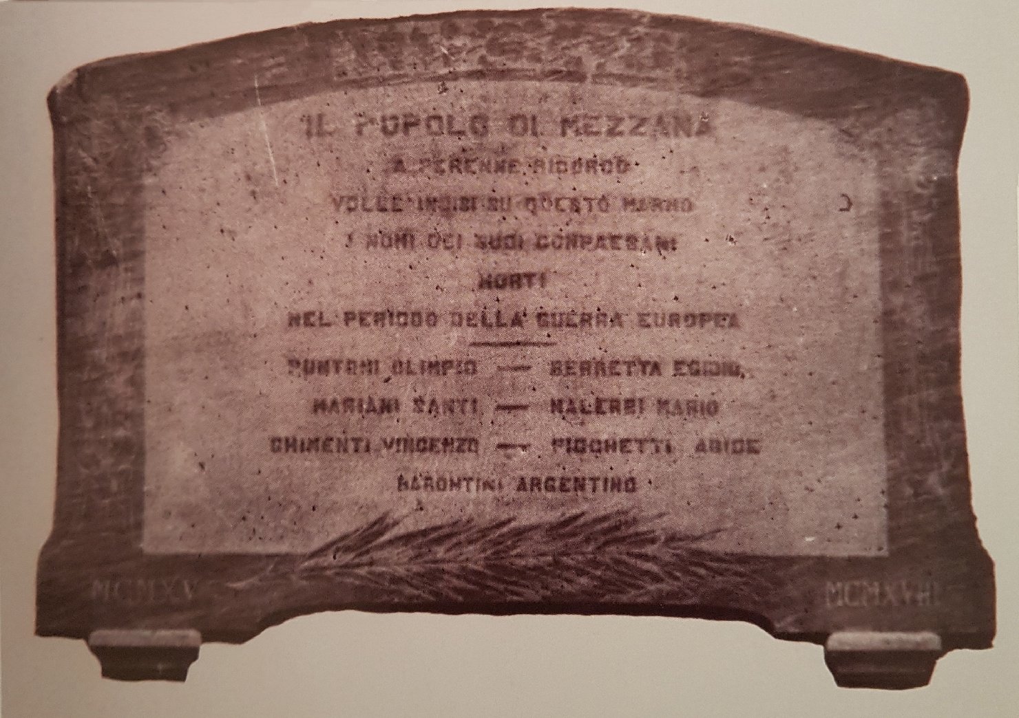 - ISCRIZIONI sulla lapide, in alto al centro - IL POPOLO DI MEZZANA/ A PERENNE RICORDO/ VOLLE INCISI SU QUESTO MARMO/ I NOMI DEI SUOI COMPAESANI/ MORTI/ NEL PERIODO DELLA GUERRA EUROPEA - maiuscolo - a incisione -