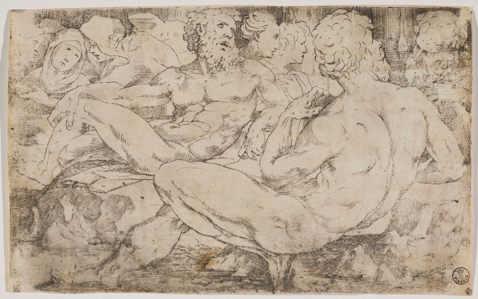 - NOTIZIE STORICO CRITICHE Impressione a bulino di prova per la serie a tecnica mista (bulino e xilografia a chiaroscuro) realizzata da Domenico Beccafumi. Che sia una prova di stampa lo si deduce sia dall’assenza delle impressioni a chiaroscuro, dall’effetto impreciso e sbordato dell’impressione (soprattutto nella parte inferiore) sia dal fatto che si tratti di un foglio di riuso. La stampa non controfondata presenta infatti sul verso un disegno a sanguigna con studi di figure equine, ciò suggerisce che il foglio fu riutilizzato e, in seguito, rifilato. Di questo stesso soggetto sono note due serie di stampe: la prima è di qualità superiore, più piccola per dimensioni e in tecnica mista (a cui appartiene il presente esemplare di prova); la seconda è invece più grande, en reverse e realizzata con la sola tecnica xilografica. La prima serie è stata attribuita dalla critica a Domenico Beccafumi e, considerato l’intenso senso pittorico della stampa, si data al 1545 ca. Il termine ante quem sarebbe inoltre desunto dalla datazione di un disegno a penna e acquerellature (19.151.5, Metropolitan Museum, New York) derivato dalla prima serie e che riporta la data “1546 otobre 15” (De Marchi 1990). Dalla prima serie deriverebbe poi la seconda, di anonimo incisore, a cui appartiene l’esemplare degli Uffizi 77 st sc.). Per questa serie postuma è stato proposto il nome di Andrea Andreani (De Marchi 1990)