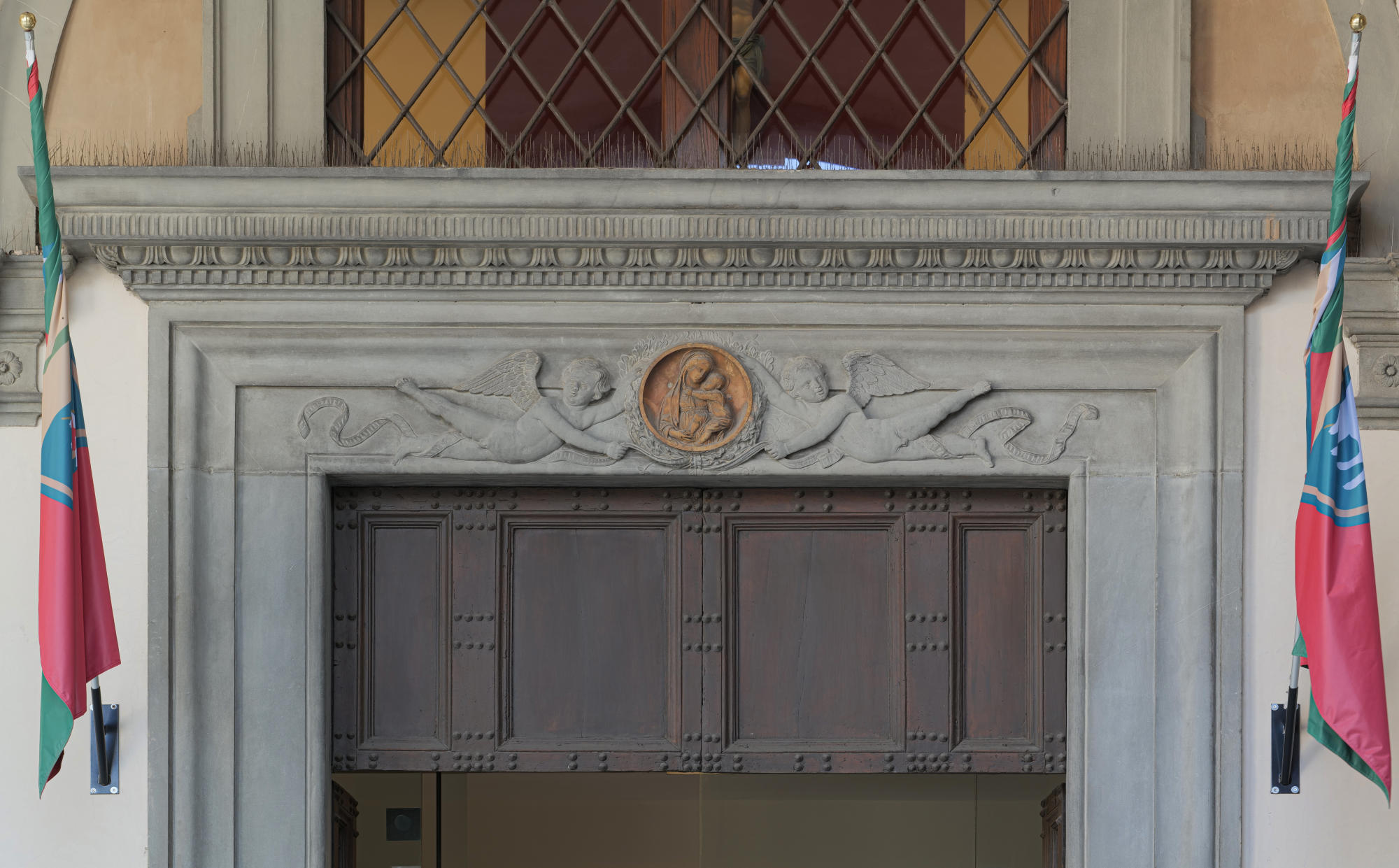 Architrave in pietra serena scolpita con due angioletti che sorreggono un serto di alloro legato con lunghi nastri svolazzanti nel quale è inserito un medaglione in terracotta raffigurante la Madonna col Bambino. L'architrave è sormontato da un cornicione sporgente e composto da modanature decrescenti decorate con motivi a scanalature, ovoli e dentelli