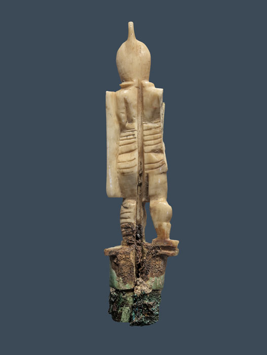 Manico di coltello a serramanico raffigurante un secutor, poggiante su un capitello sinteticamente abbozzato, nel quale era innestata la lama del coltello. Una fessura sul retro della figura serviva da incasso per la lama pieghevole